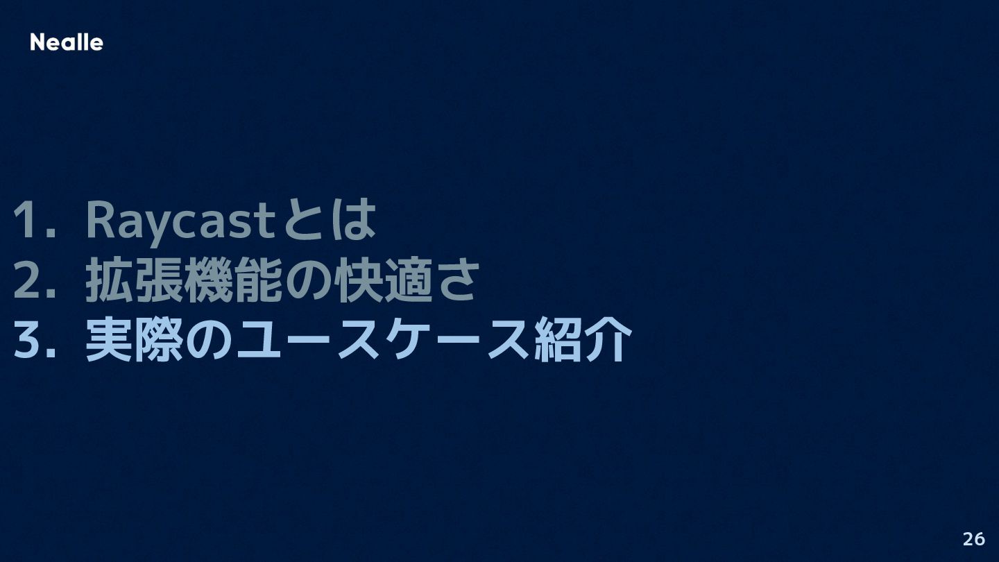 26 1. Raycastとは 2. 拡張機能の快適さ 3. 実際のユースケース紹介