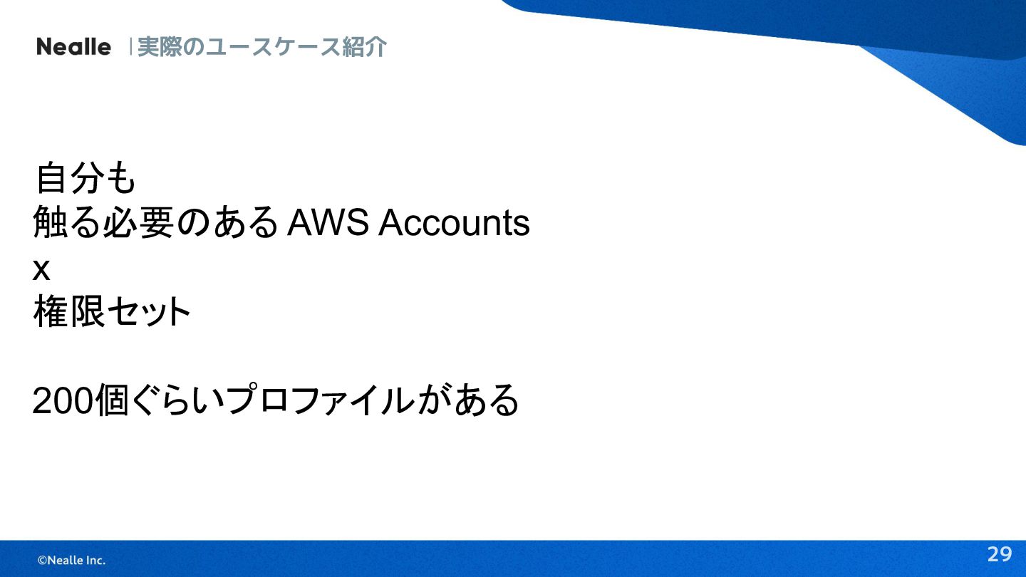 29 自分も 触る必要のある AWS Accounts x 権限セット 200個ぐらいプロファイルがある 実際のユースケース紹介
