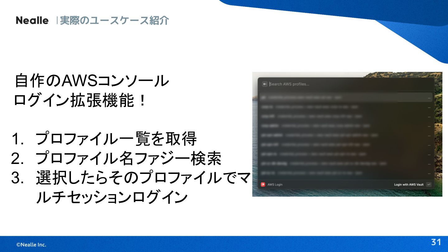 31 自作のAWSコンソール ログイン拡張機能! 1. プロファイル一覧を取得 2. プロファイル名ファジー検索 3. 選択したらそのプロファイルでマ ルチセッションログイン