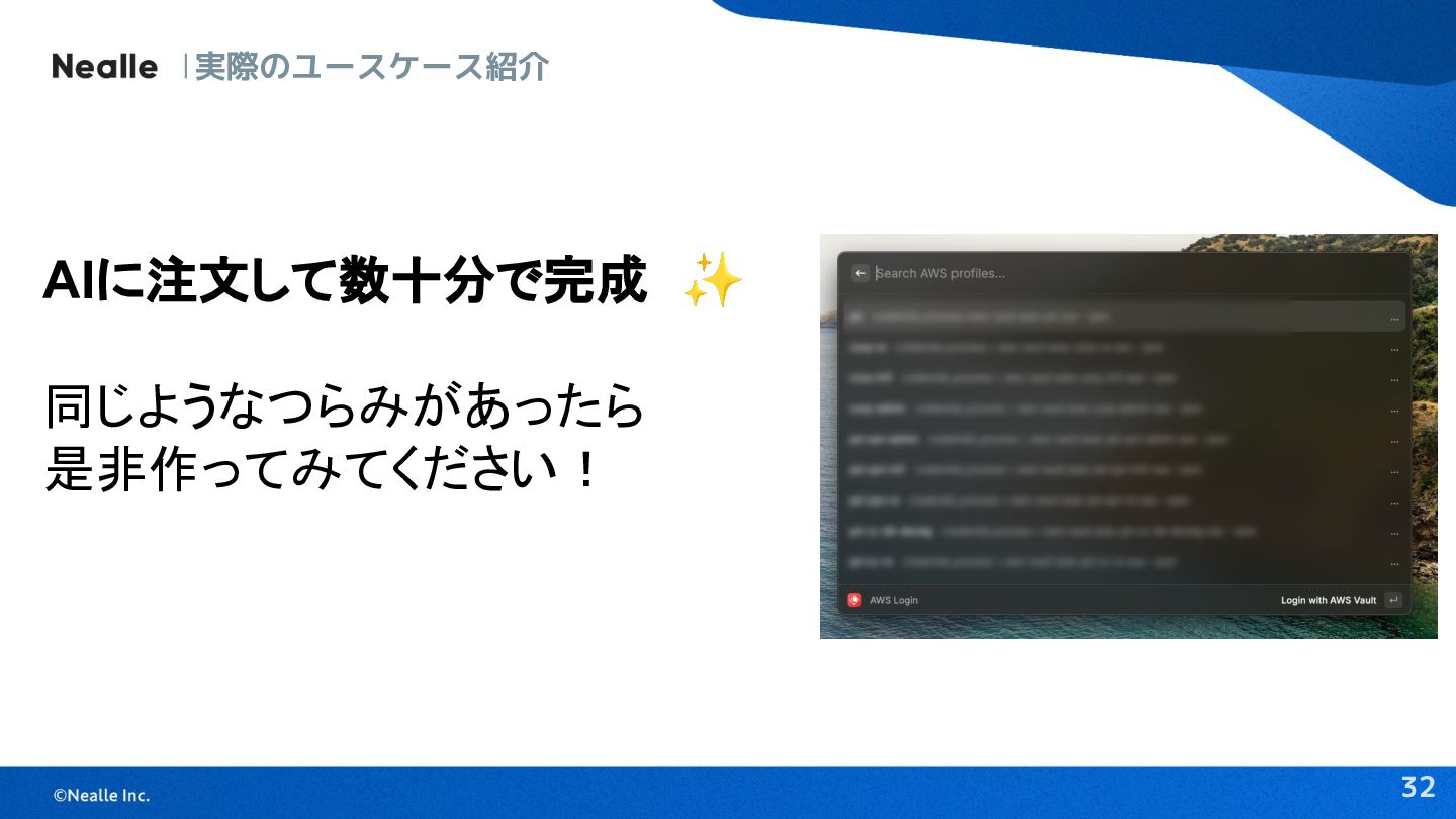 32 AIに注文して数十分で完成 ✨ 同じようなつらみがあったら 是非作ってみてください! 実際のユースケース紹介