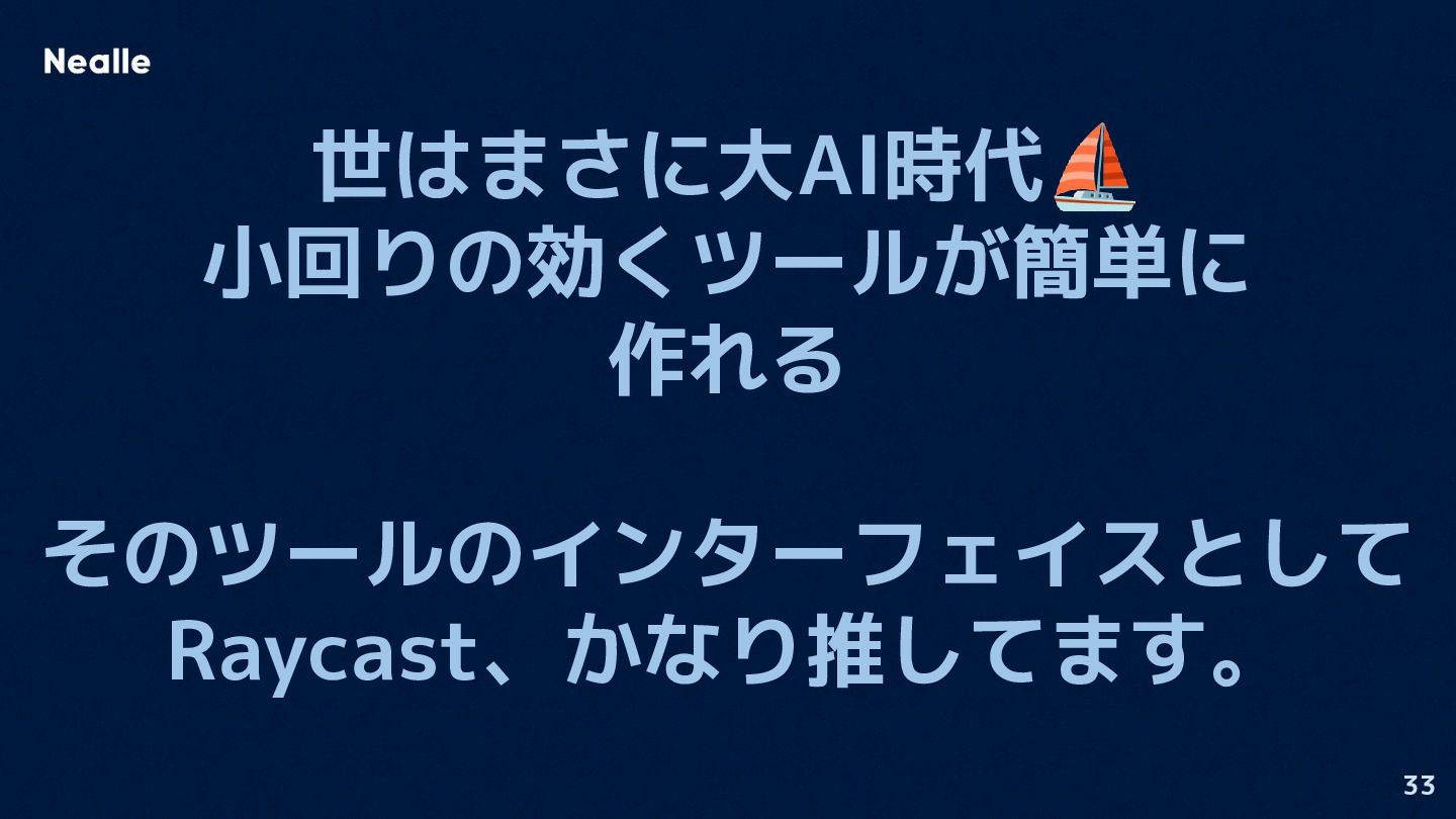 世はまさに大AI時代⛵ 小回りの効くツールが簡単に 作れる そのツールのインターフェイスとして Raycast、かなり推してます。 33