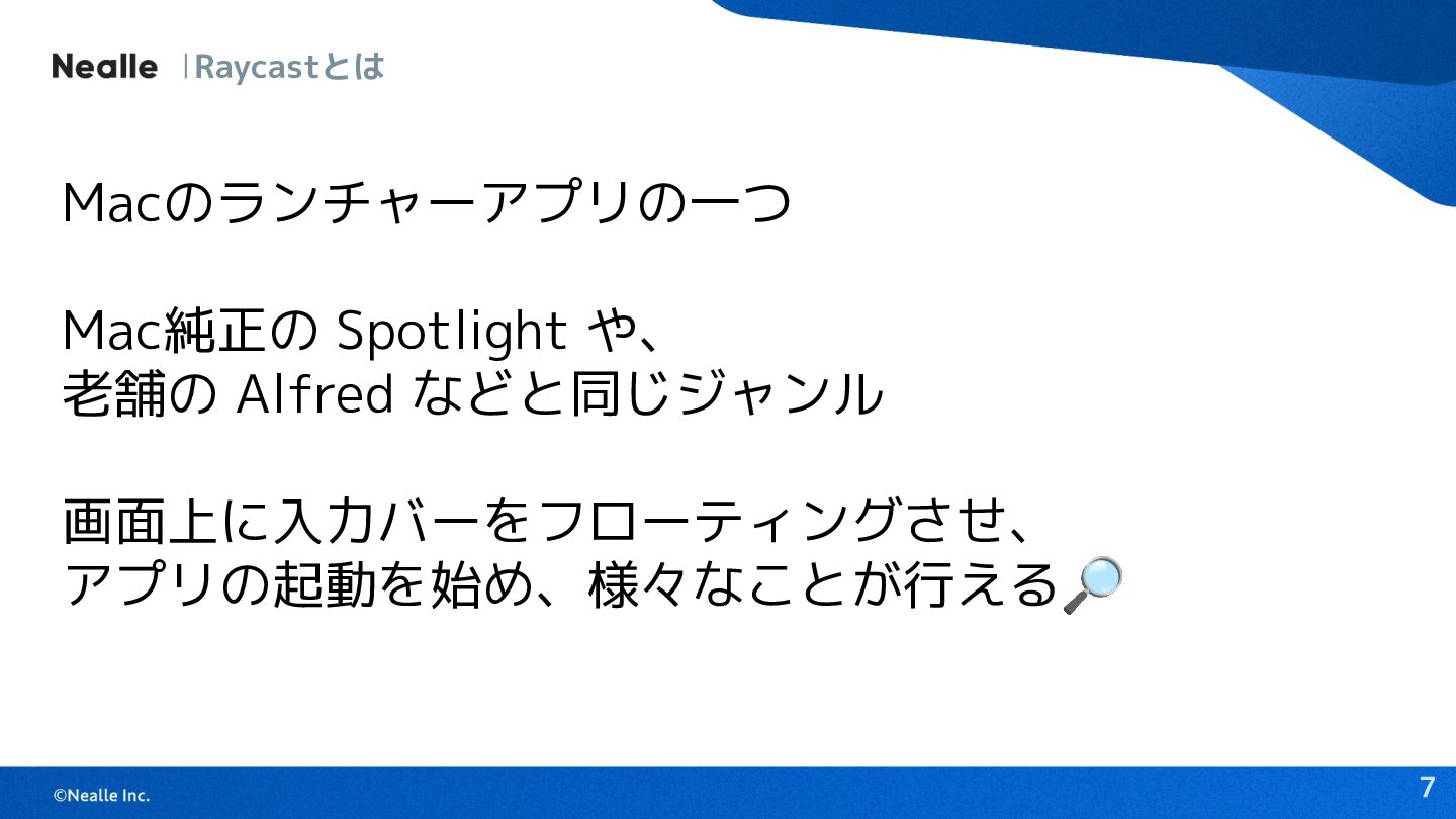 Macのランチャーアプリの一つ Mac純正の Spotlight や、 老舗の Alfred などと同じジャンル 画面上に入力バーをフローティングさせ、 アプリの起動を始め、様々なことが行える🔎 7