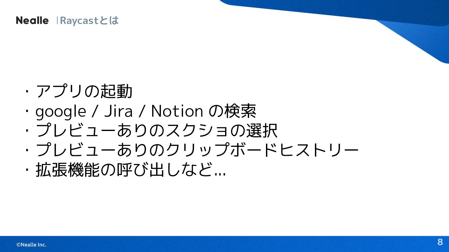 8 Raycastとは ・アプリの起動 ・google / Jira / Notion の検索 ・プレビューありのスクショの選択