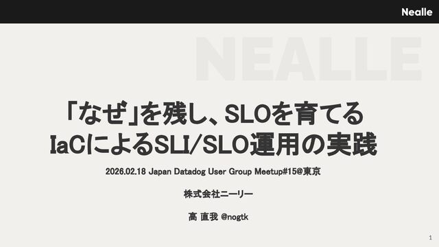 直我 @nogtk NEALLE 「なぜ」を残し、SLOを育てる IaCによるSLI/SLO運用の実践 1