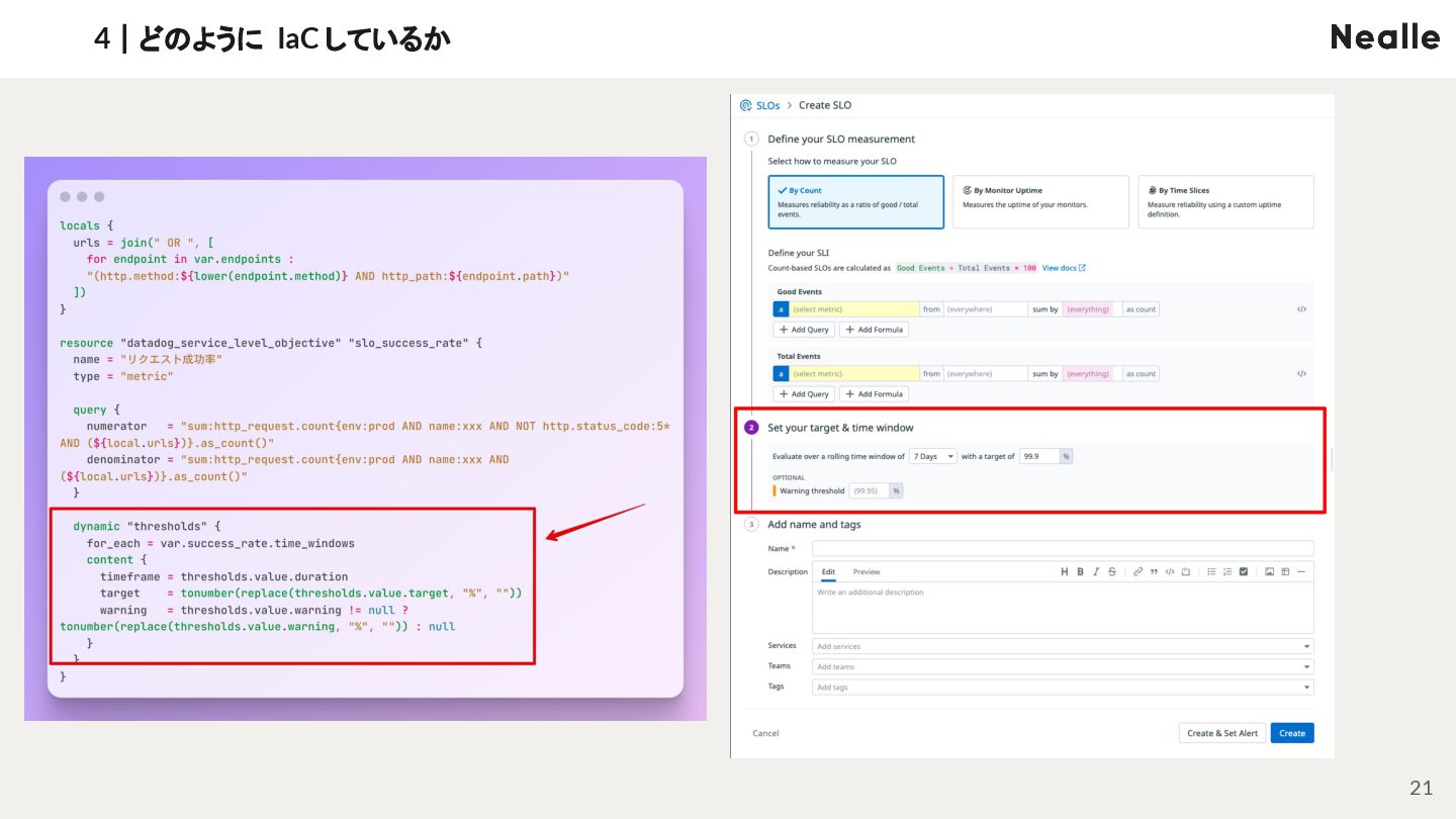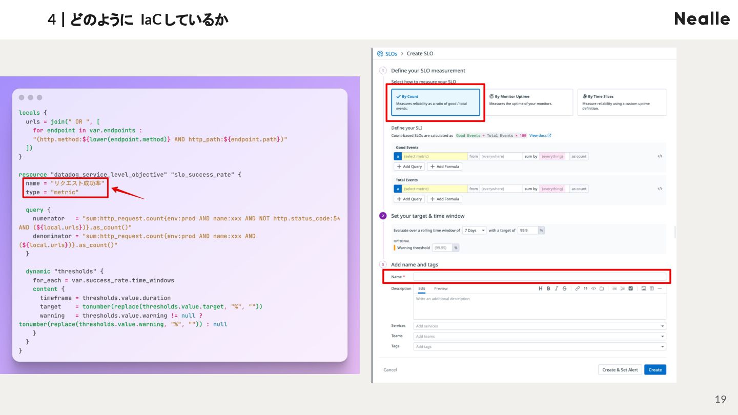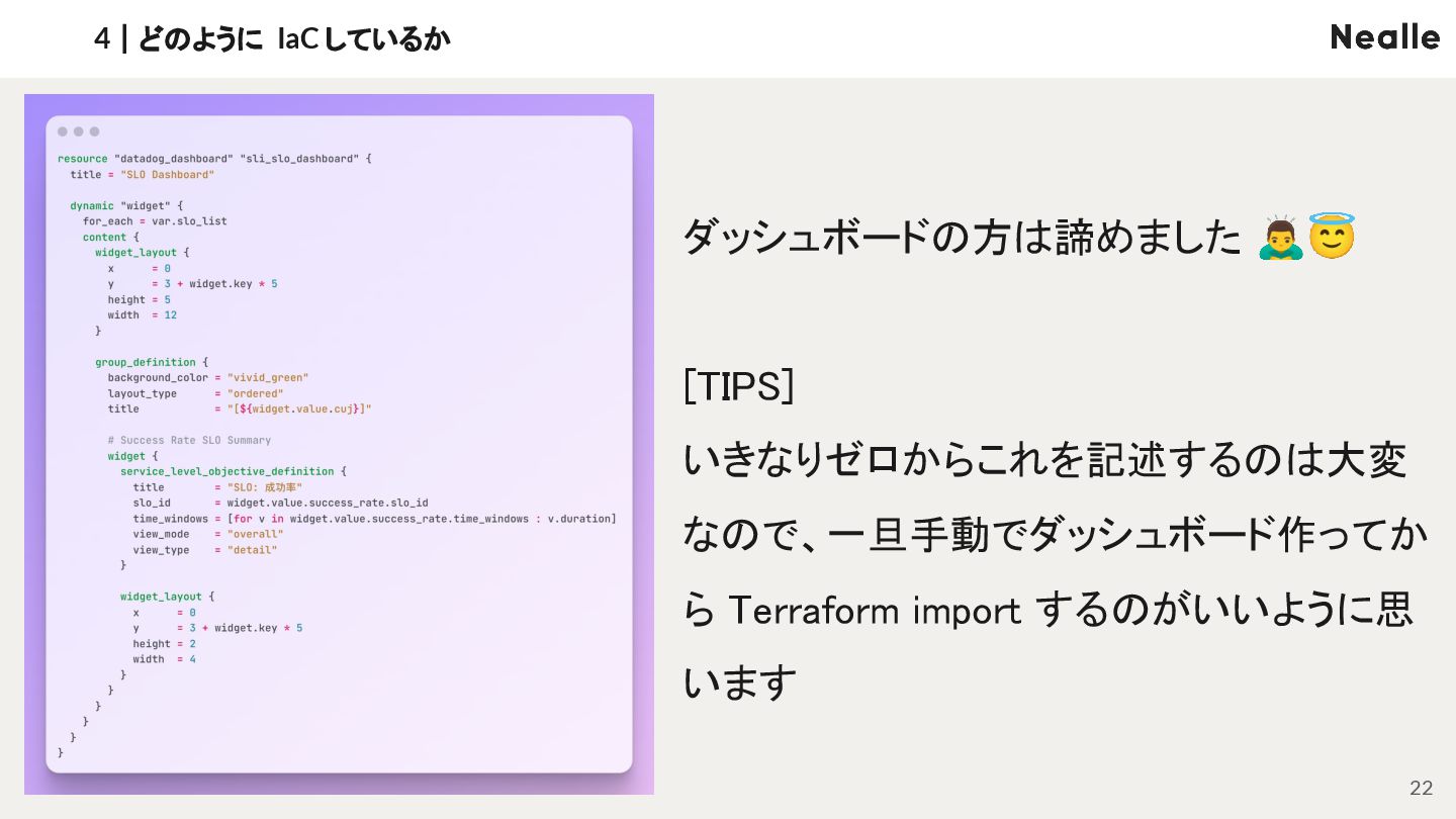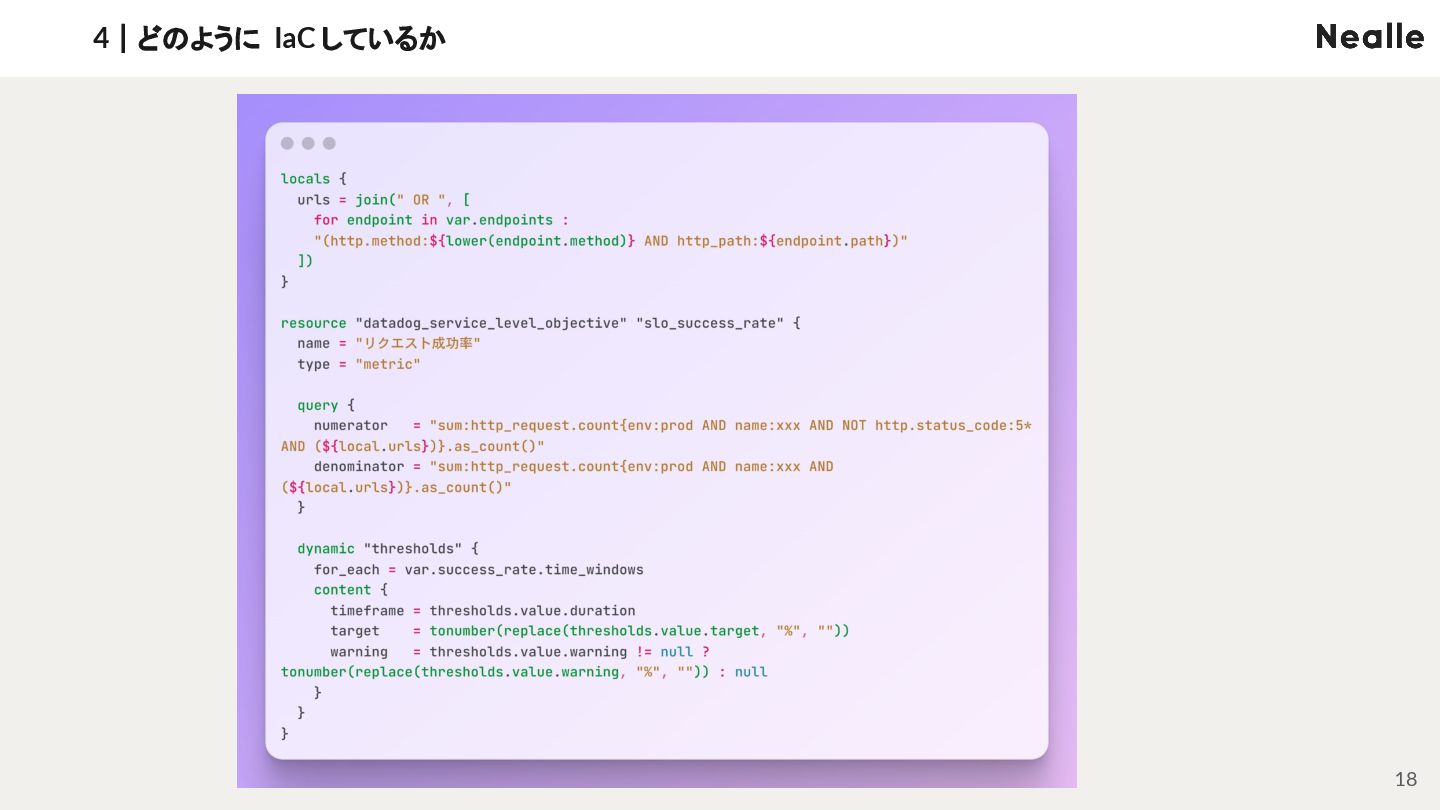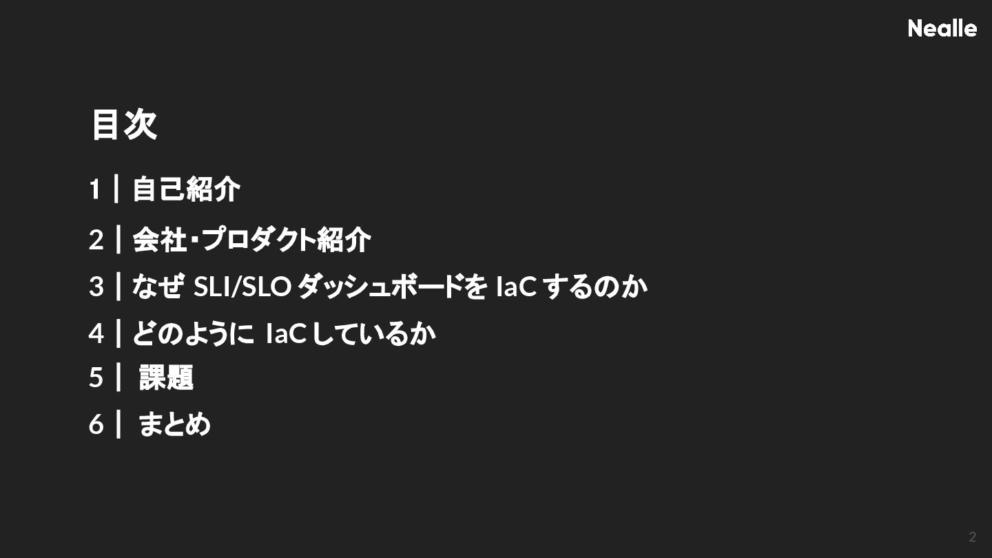 3|なぜ SLI/SLO ダッシュボードを IaC するのか NEALLE 1|会社概要 7