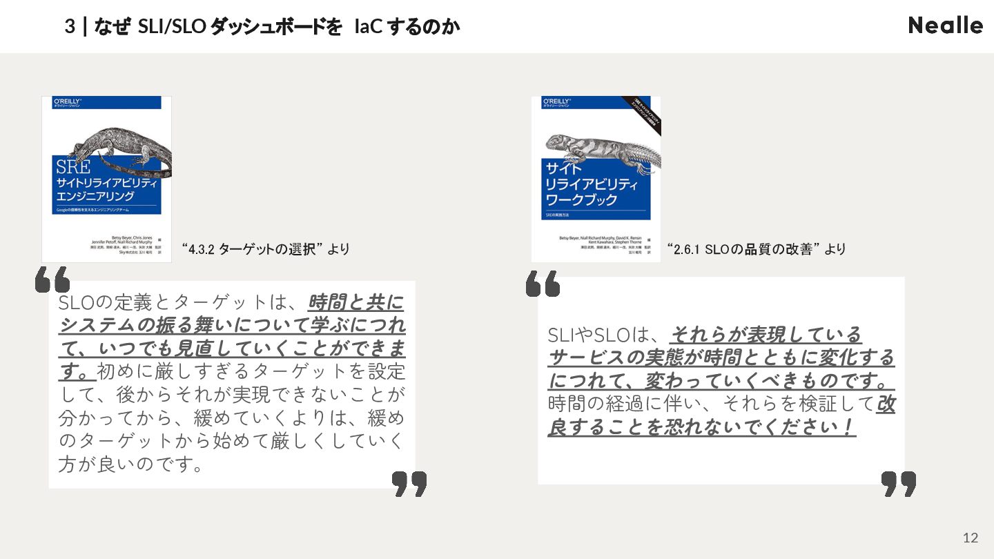 3|なぜ SLI/SLO ダッシュボードを IaC するのか 12 SLOの定義とターゲットは、時間と共に システムの振る舞いについて学ぶにつれ て、いつでも見直していくことができま す。初めに厳しすぎるターゲットを設定