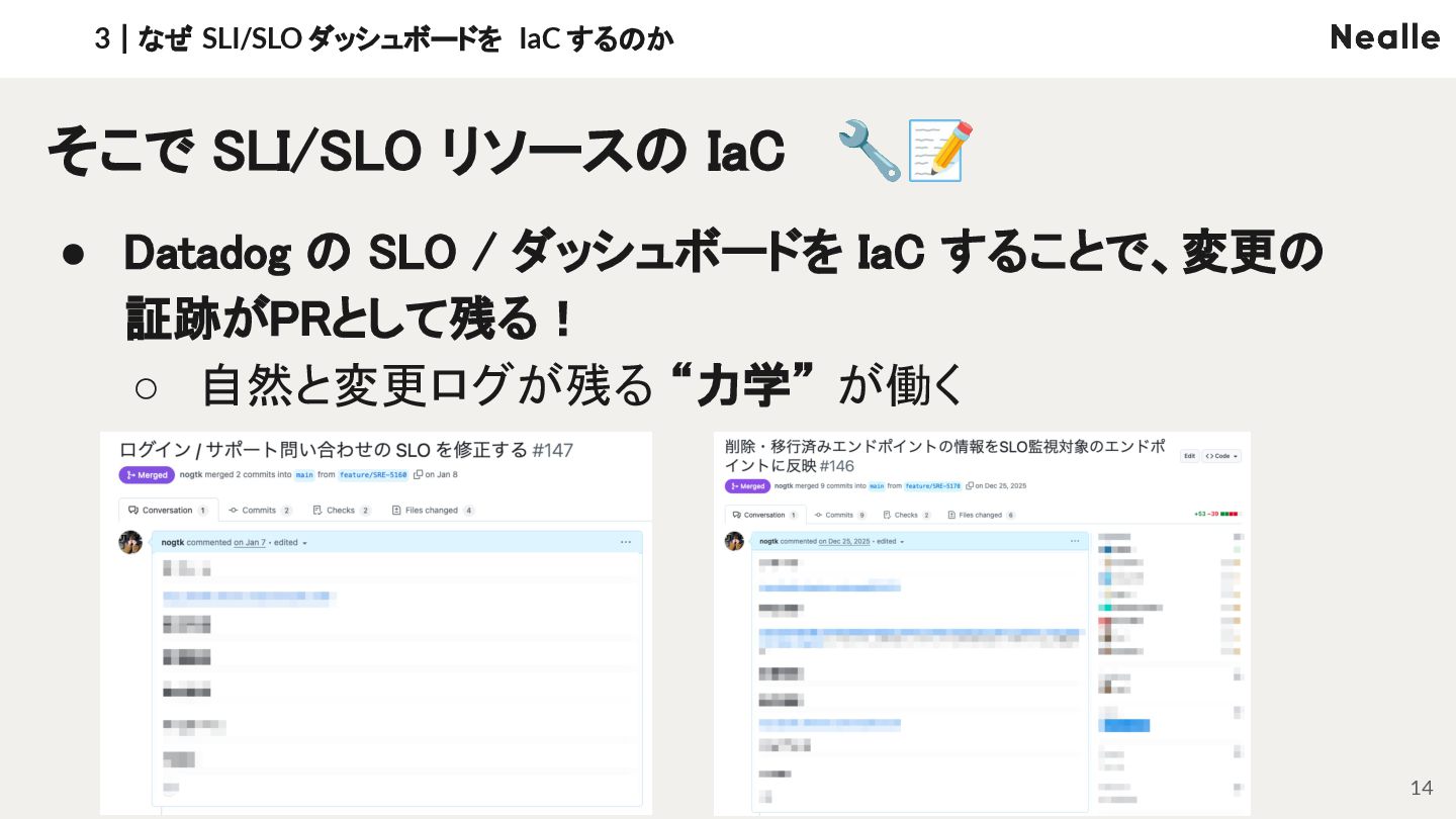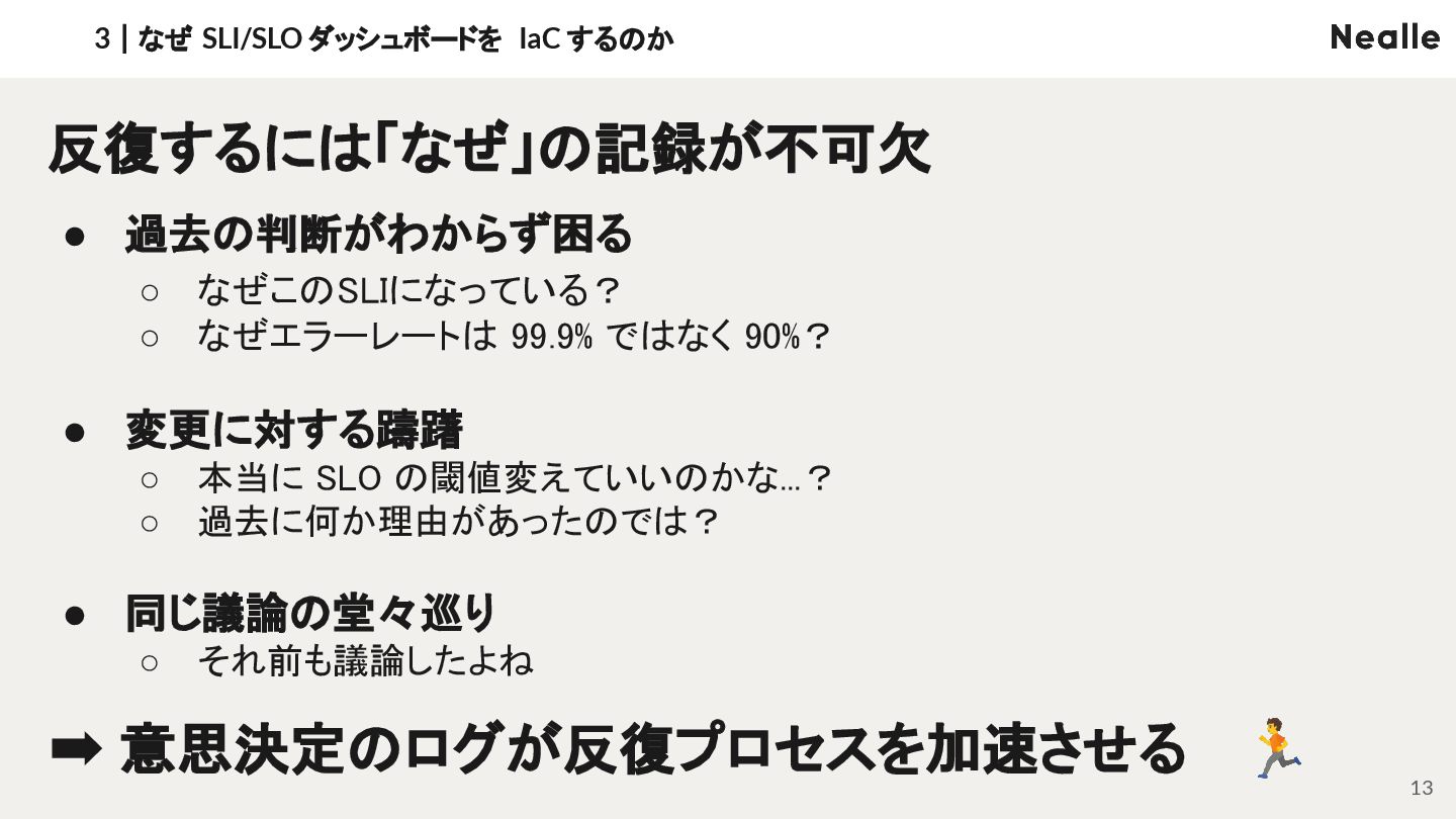 • 変更に対する躊躇 ◦ 本当に SLO の閾値変えていいのかな...? ◦ 過去に何か理由があったのでは? • 同じ議論の堂々巡り ◦ それ前も議論したよね 3|なぜ SLI/SLO ダッシュボードを IaC するのか 13 反復するには「なぜ」の記録が不可欠 ➡ 意思決定のログが反復プロセスを加速させる 🏃