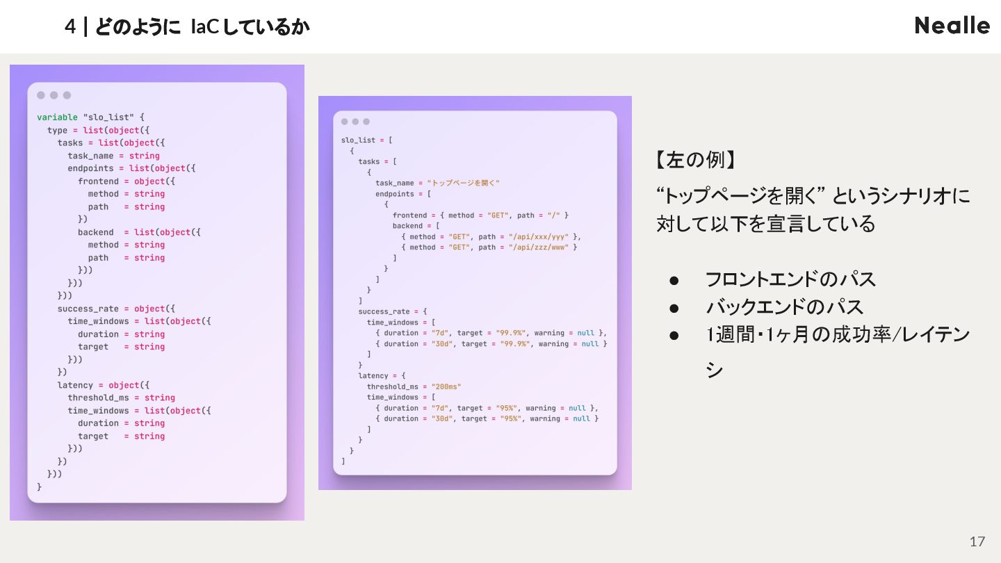 4|どのように IaC しているか 16 ① SLO のリストを宣言 ② SLO