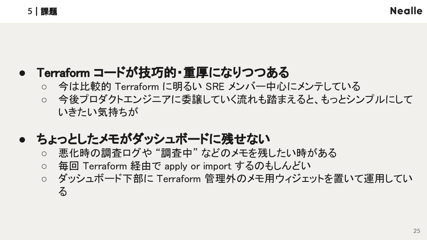 に明るい SRE メンバー中心にメンテしている ◦ 今後プロダクトエンジニアに委譲していく流れも踏まえると、もっとシンプルにして いきたい気持ちが • ちょっとしたメモがダッシュボードに残せない ◦ 悪化時の調査ログや “調査中” などのメモを残したい時がある ◦ 毎回 Terraform 経由で apply or import するのもしんどい ◦ ダッシュボード下部に Terraform 管理外のメモ用ウィジェットを置いて運用してい る
