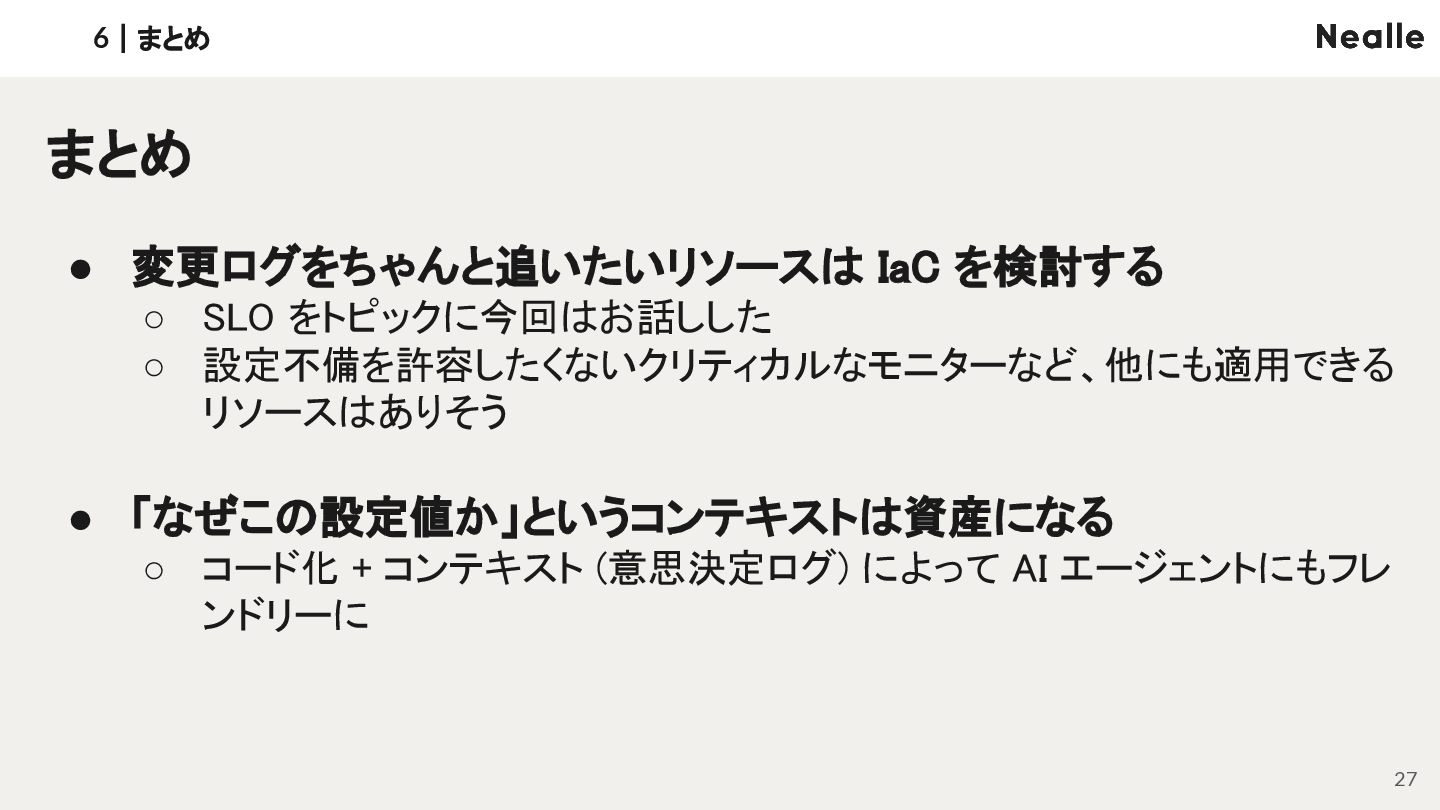 • 変更ログをちゃんと追いたいリソースは IaC を検討する ◦ SLO をトピックに今回はお話しした ◦ 設定不備を許容したくないクリティカルなモニターなど、他にも適用できる