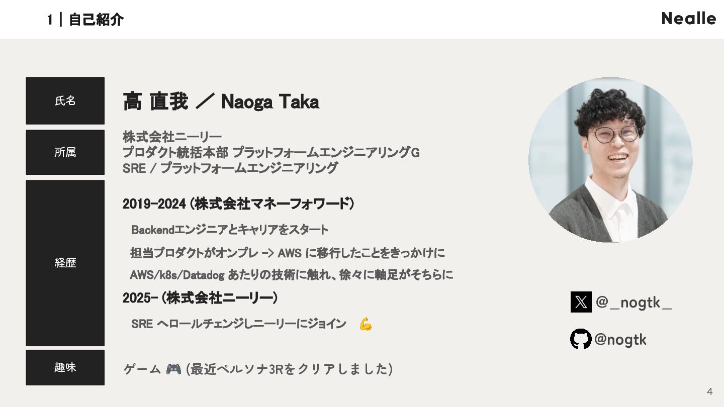 株式会社ニーリー プロダクト統括本部 プラットフォームエンジニアリングG SRE / プラットフォームエンジニアリング 趣味 ゲーム 🎮 (最近ペルソナ3Rをクリアしました) 2019-2024 (株式会社マネーフォワード) Backendエンジニアとキャリアをスタート 担当プロダクトがオンプレ -> AWS に移行したことをきっかけに AWS/k8s/Datadog あたりの技術に触れ、徐々に軸足がそちらに 2025- (株式会社ニーリー) SRE へロールチェンジしニーリーにジョイン 💪 1|自己紹介 @_nogtk_ @nogtk
