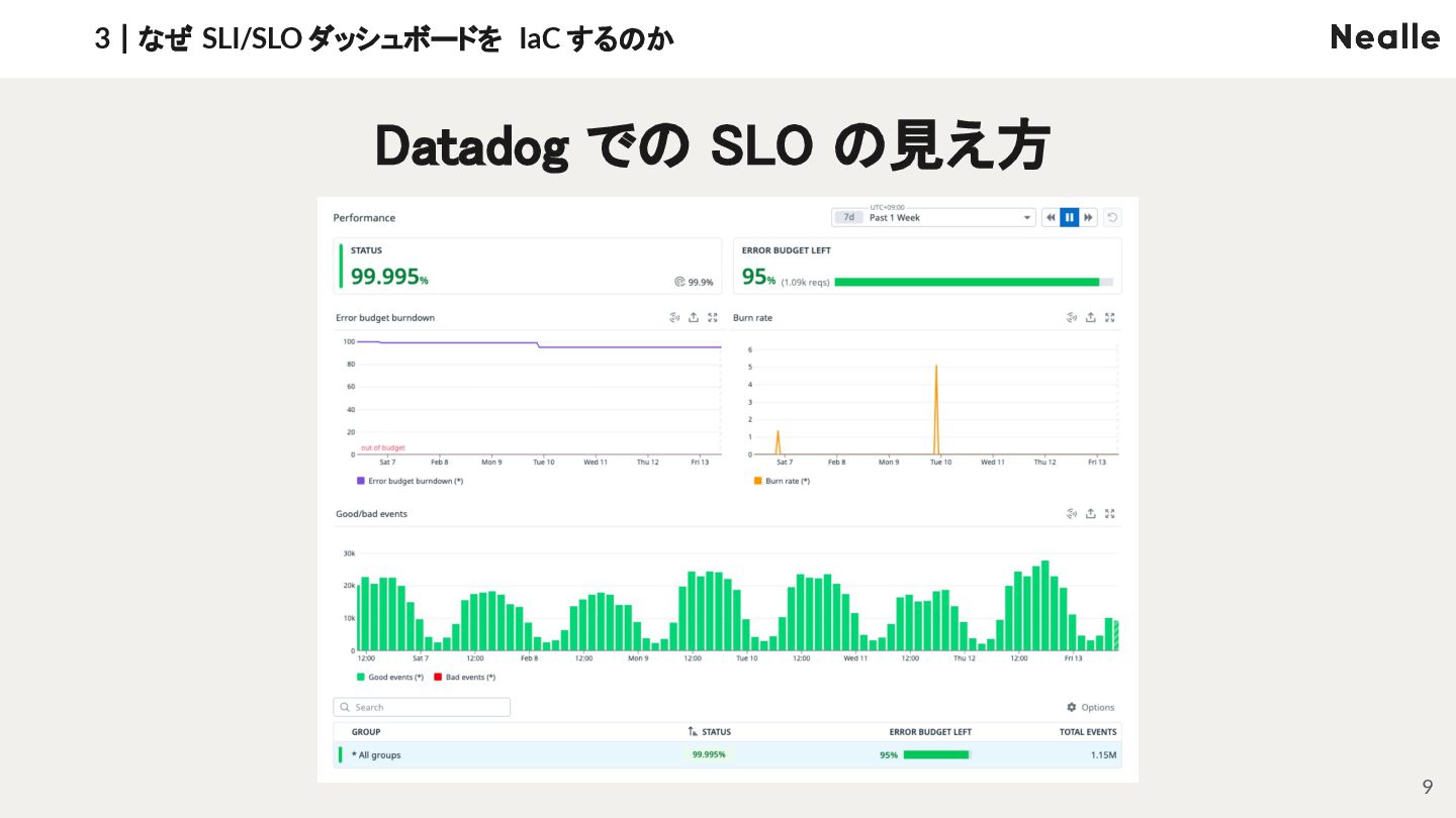 3|なぜ SLI/SLO ダッシュボードを IaC するのか 9 Datadog での SLO の見え方