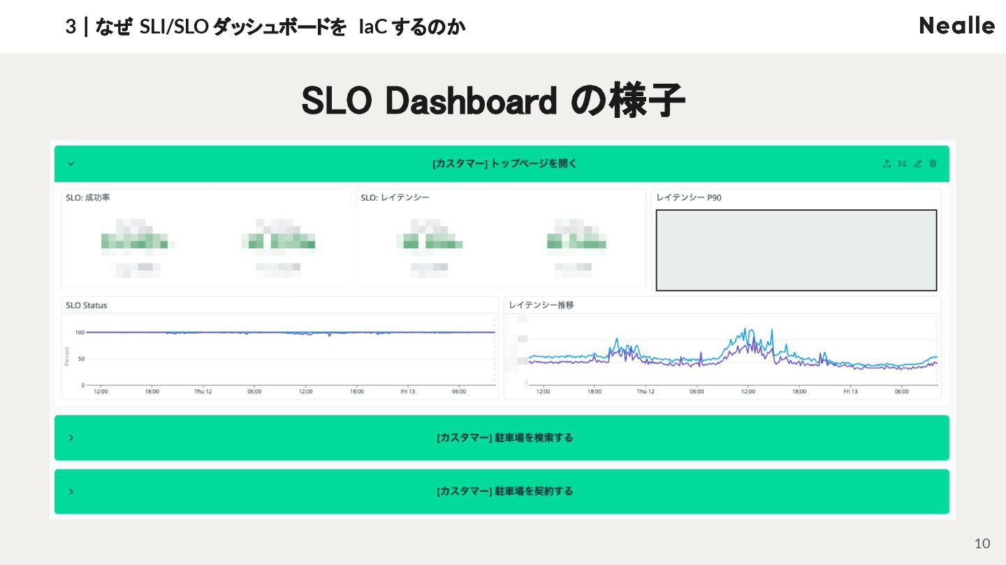 3|なぜ SLI/SLO ダッシュボードを IaC するのか 10 SLO Dashboard の様子