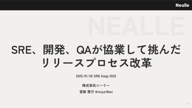2025/01/26 SRE Kaigi 2025 株式会社ニーリー 宮後 啓介 @miya10kei NEALLE SRE、開発、QAが協業して挑んだ