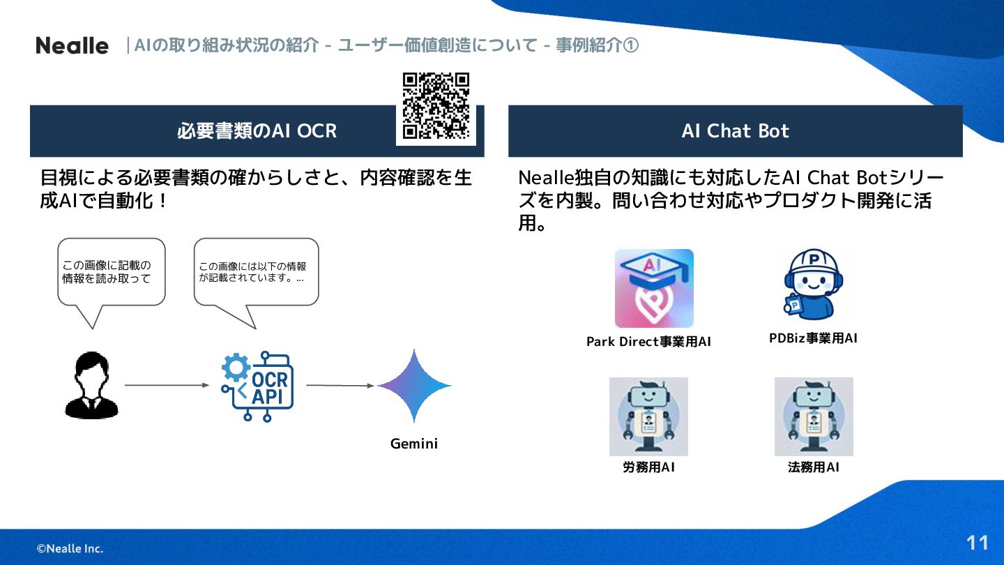 この画像に記載の 情報を読み取って Gemini この画像には以下の情報 が記載されています。... Nealle独自の知識にも対応したAI Chat Botシリー ズを内製。問い合わせ対応やプロダクト開発に活 用。 AI Chat Bot Park Direct事業用AI PDBiz事業用AI 労務用AI 法務用AI