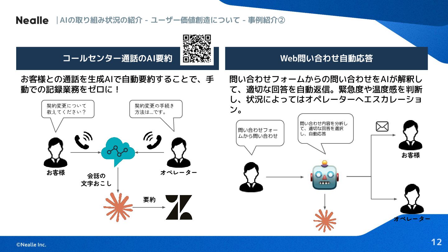 4. AIの取り組み状況の紹介 - ユーザー価値創造について - 事例紹介② 12 コールセンター通話のAI要約 お客様との通話を生成AIで自動要約することで、手 動での記録業務をゼロに! 会話の