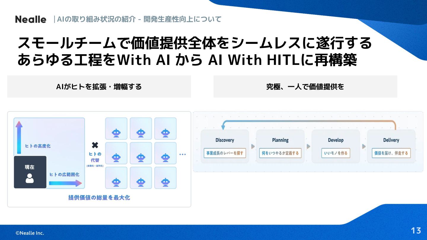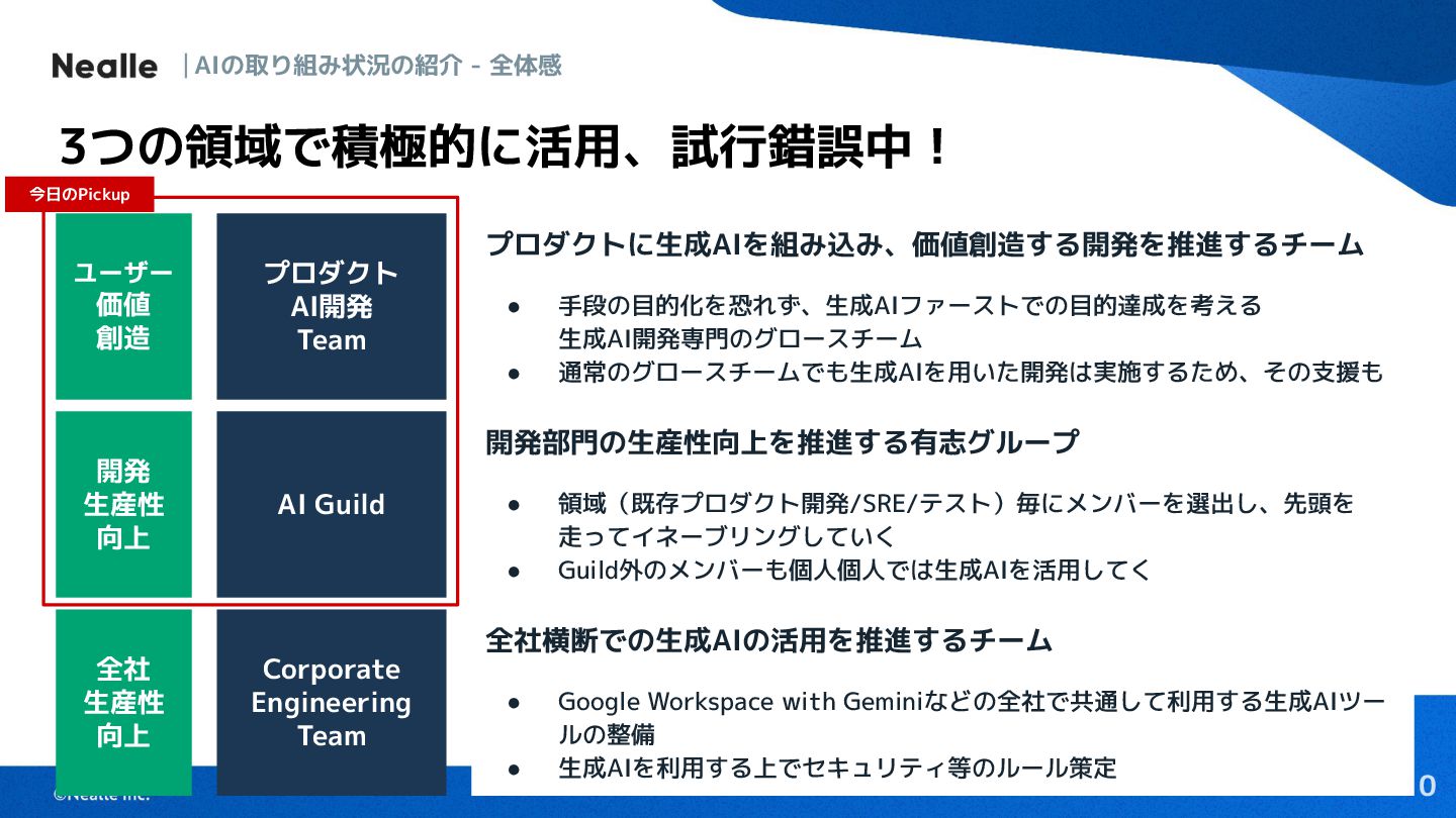 Geminiなどの全社で共通して利用する生成AIツー ルの整備 • 生成AIを利用する上でセキュリティ等のルール策定 Corporate Engineering Team プロダクト AI開発 Team AI Guild 開発部門の生産性向上を推進する有志グループ • 領域(既存プロダクト開発/SRE/テスト)毎にメンバーを選出し、先頭を 走ってイネーブリングしていく • Guild外のメンバーも個人個人では生成AIを活用してく ユーザー 価値 創造 開発 生産性 向上 プロダクトに生成AIを組み込み、価値創造する開発を推進するチーム • 手段の目的化を恐れず、生成AIファーストでの目的達成を考える 生成AI開発専門のグロースチーム • 通常のグロースチームでも生成AIを用いた開発は実施するため、その支援も 全社 生産性 向上 今日のPickup
