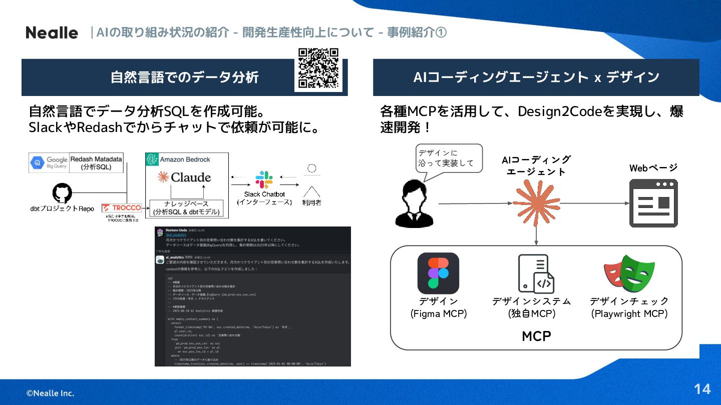 5. AIの取り組み状況の紹介 - 開発生産性向上について - 事例紹介① 14 自然言語でのデータ分析 AIコーディングエージェント x デザイン