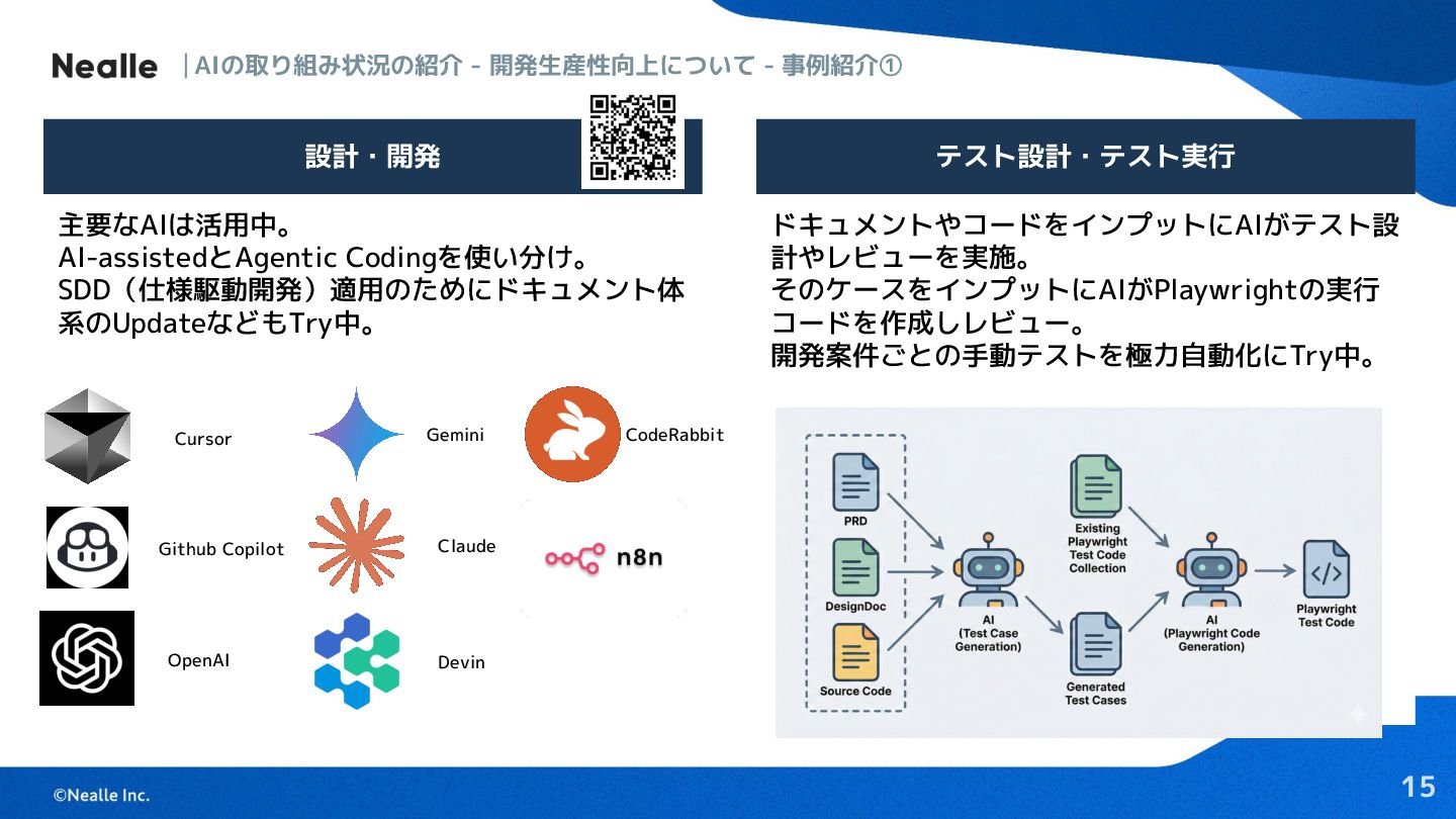 Codingを使い分け。 SDD(仕様駆動開発)適用のためにドキュメント体 系のUpdateなどもTry中。 ドキュメントやコードをインプットにAIがテスト設 計やレビューを実施。 そのケースをインプットにAIがPlaywrightの実行 コードを作成しレビュー。 開発案件ごとの手動テストを極力自動化にTry中。 Gemini Claude Devin Cursor Github Copilot OpenAI CodeRabbit
