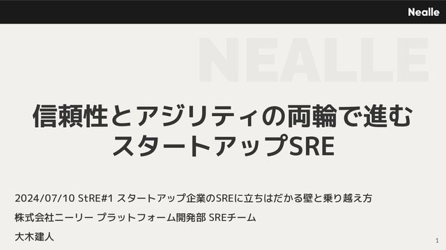 2024/07/10 StRE#1 スタートアップ企業のSREに立ちはだかる壁と乗り越え方 株式会社ニーリー プラットフォーム開発部 SREチーム 大木建人 NEALLE 信頼性とアジリティの両輪で進む スタートアップSRE
