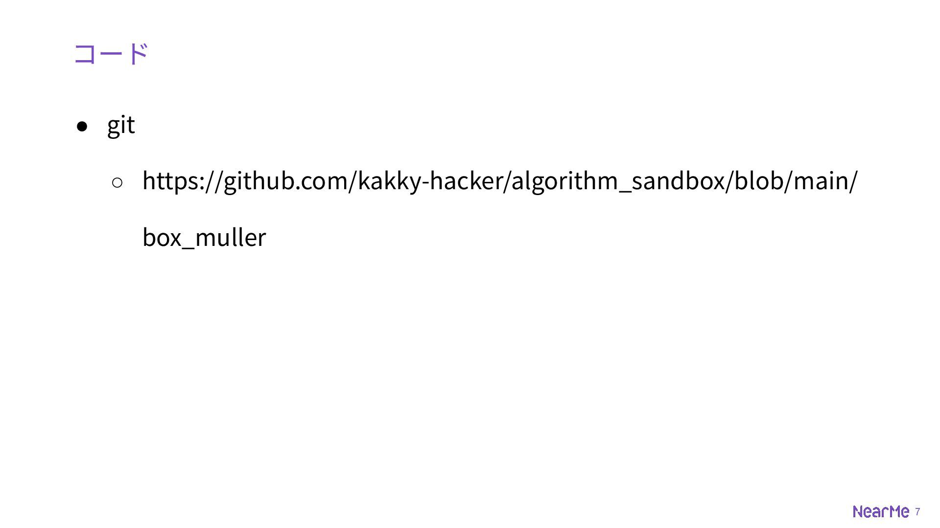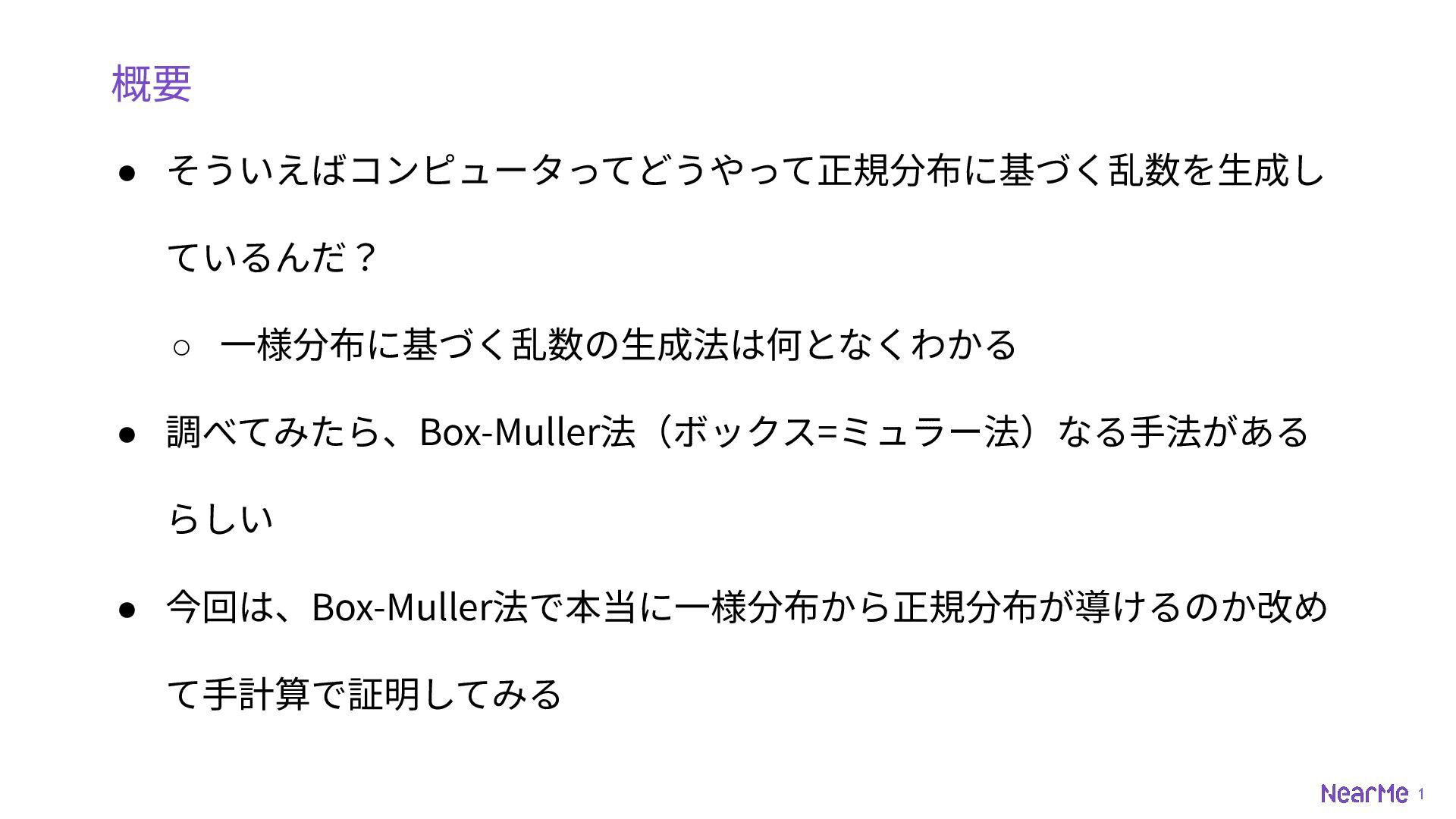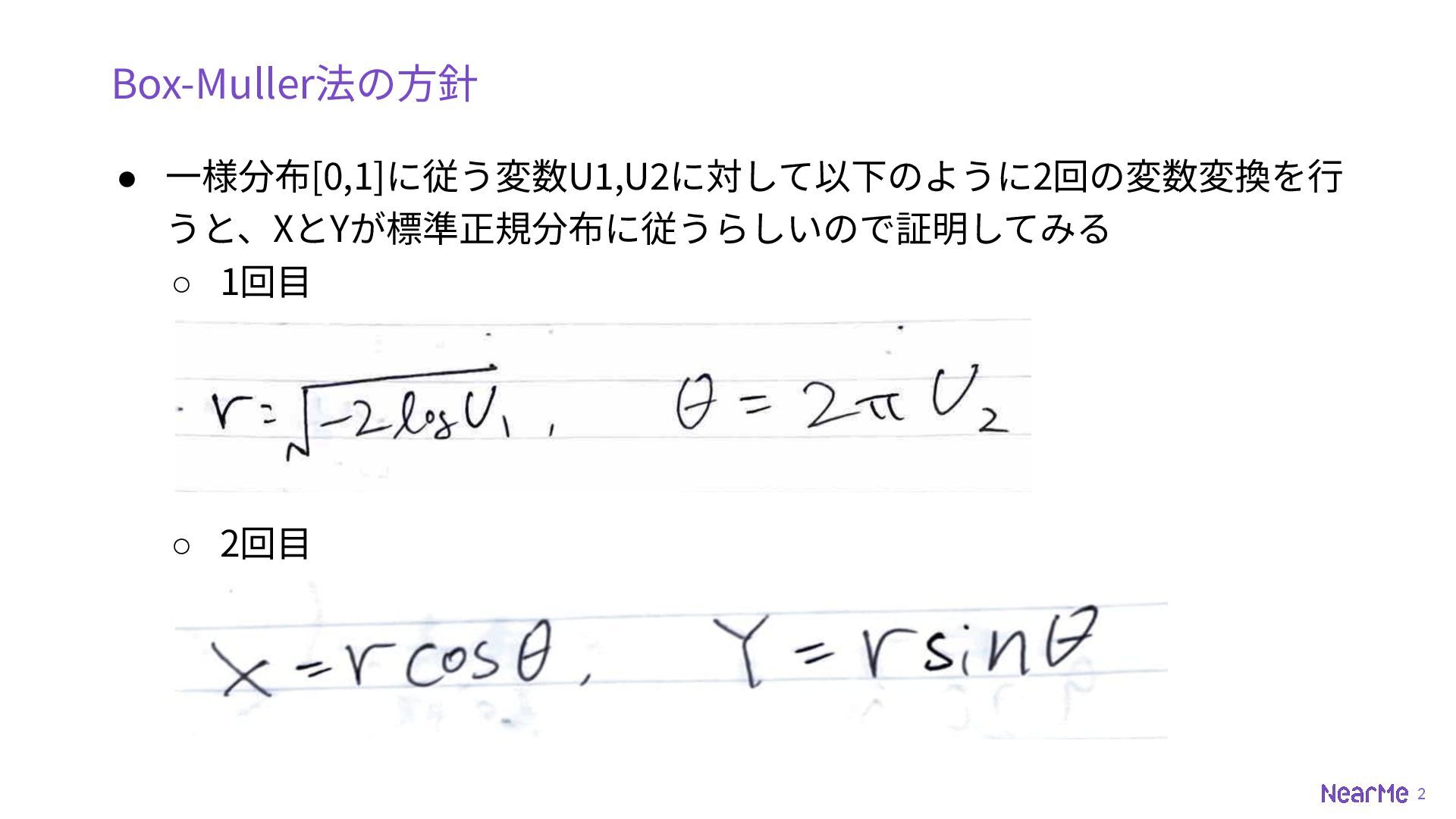 0 Box-Muller法 2025-10-10 第132回NearMe技術勉強会 Takuma KAKINOUE