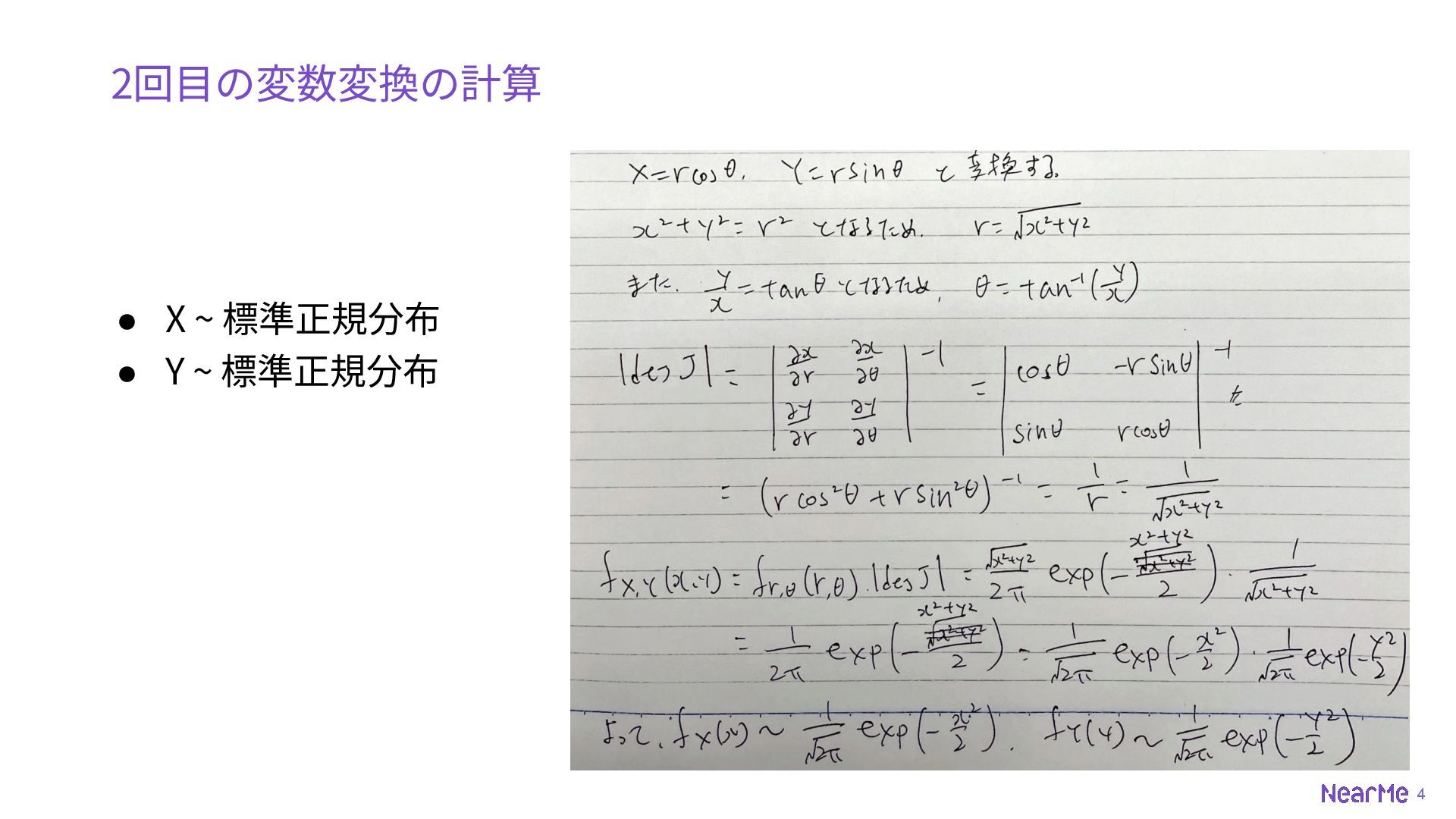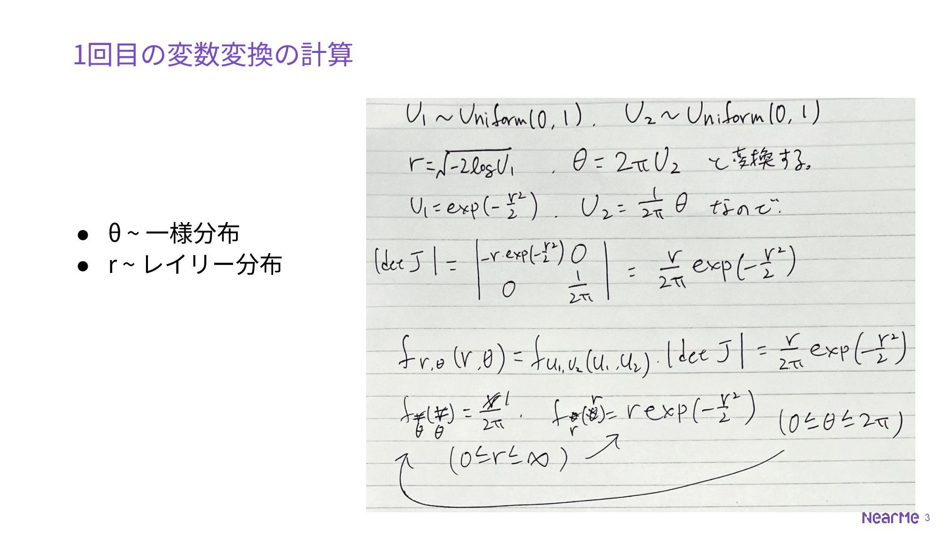 • 今回は、Box-Muller法で本当に⼀様分布から正規分布が導けるのか改め て⼿計算で証明してみる