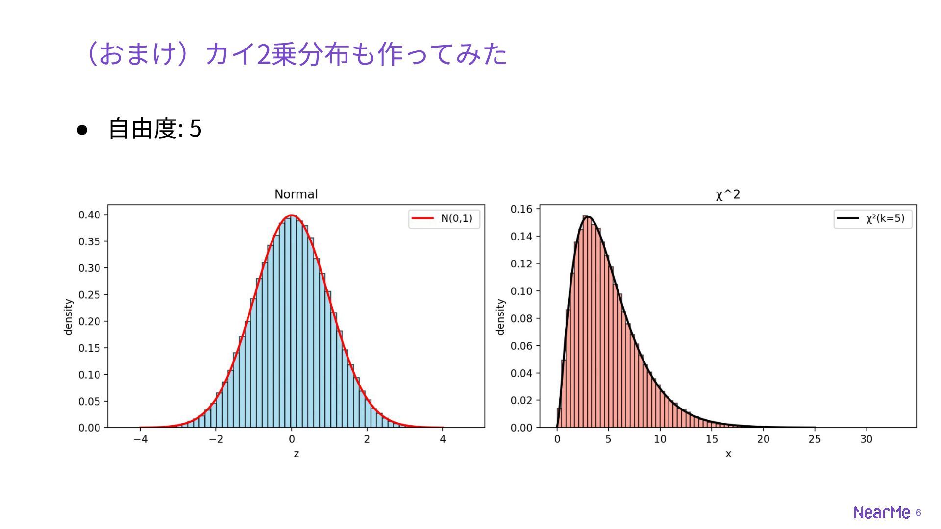 5 Box-Muller法を実装して正規分布を作ってみた • ちゃんと正規分布に変換されている!! ※ ⼀様分布はnp.random.randで⽣成