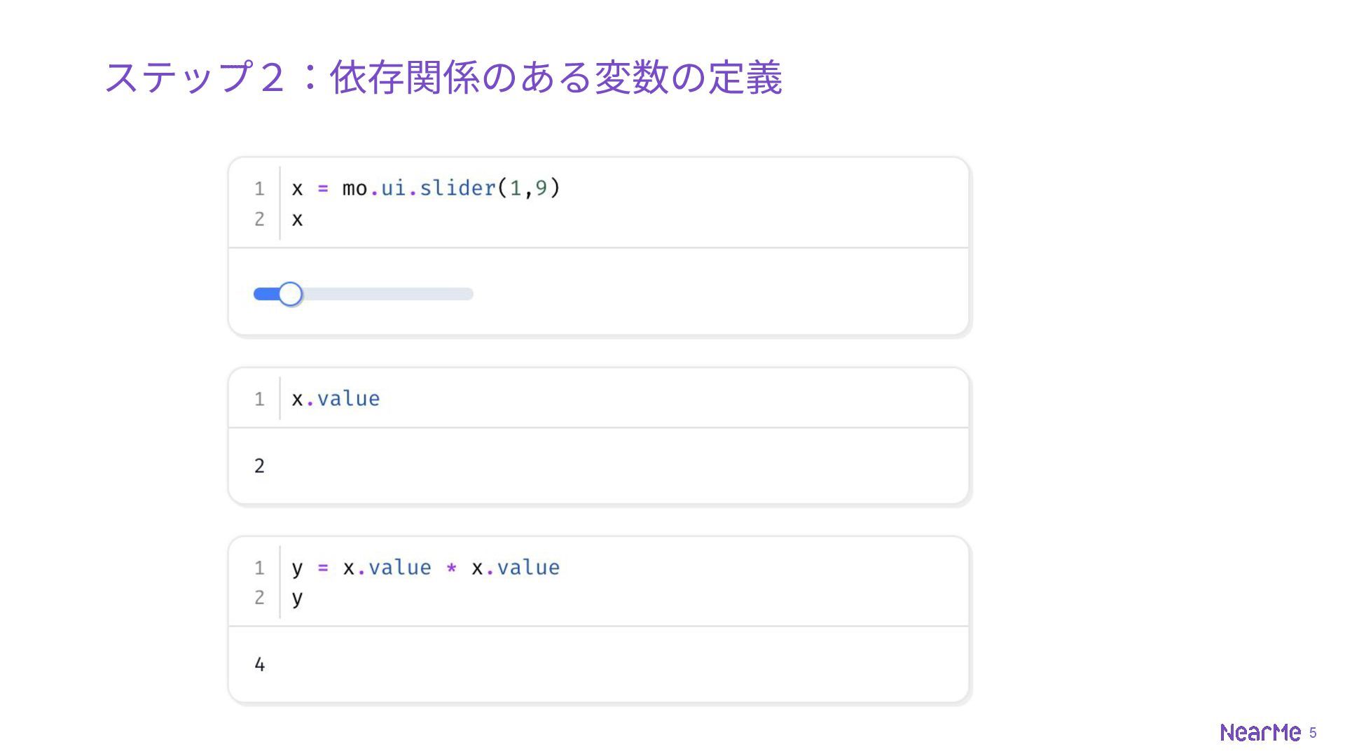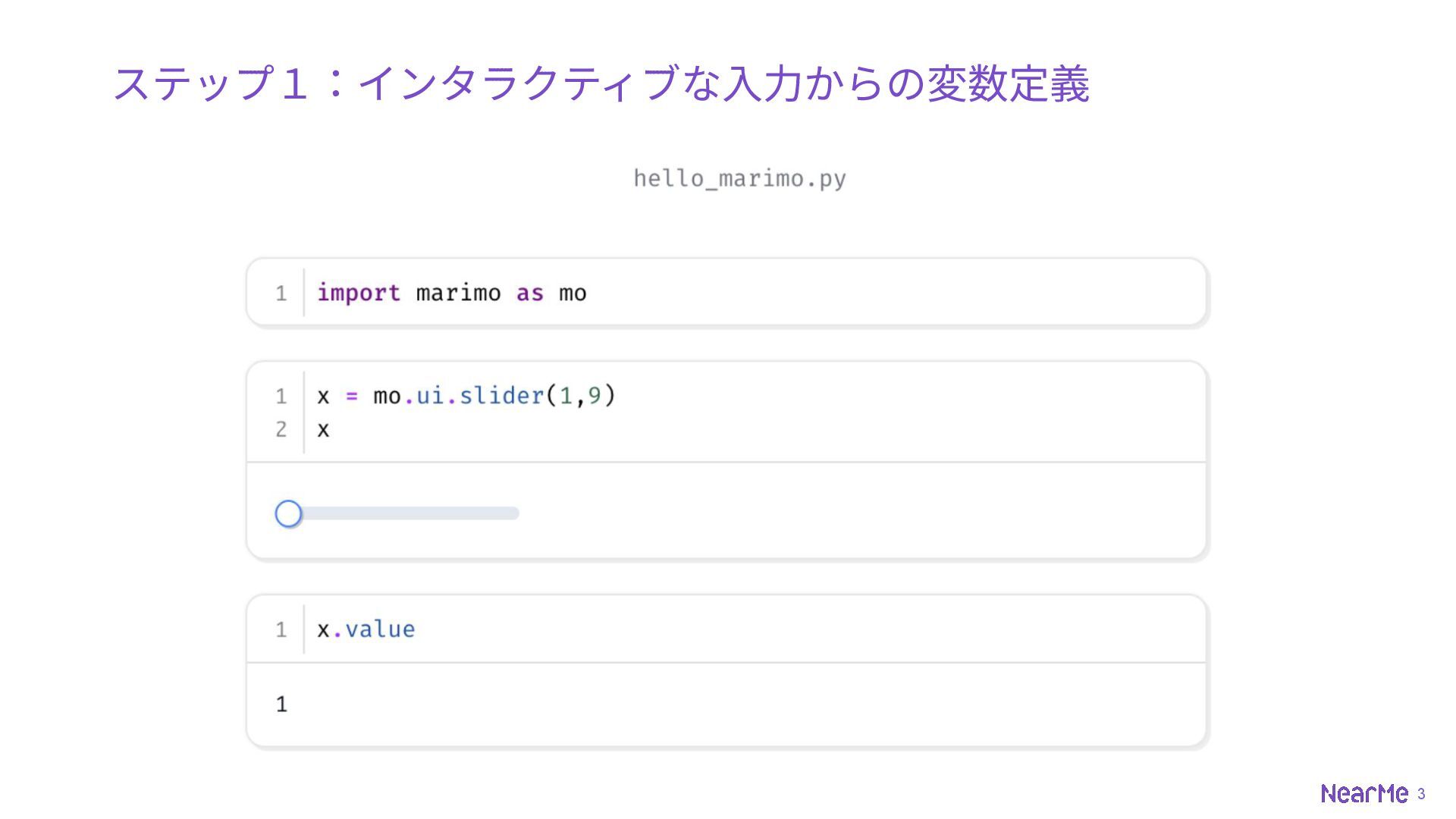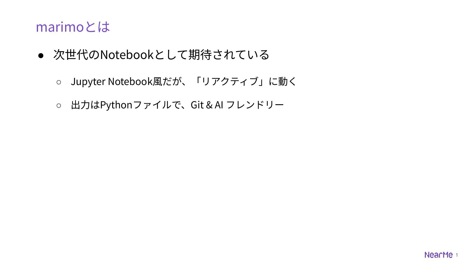 1 marimoとは • 次世代のNotebookとして期待されている ◦ Jupyter Notebook⾵だが、「リアクティブ」に動く ◦ 出⼒はPythonファイルで、Git &