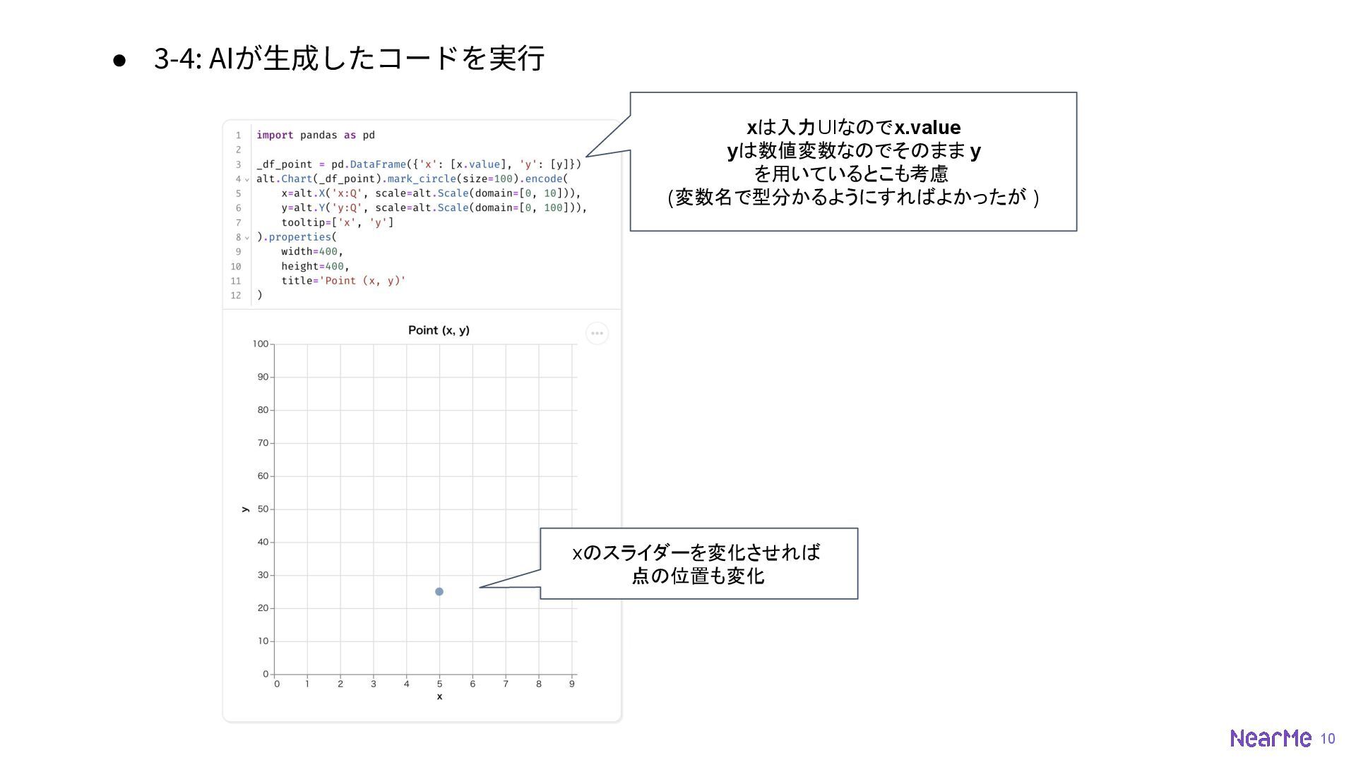 10 • 3-4: AIが⽣成したコードを実⾏ xのスライダーを変化させれば 点の位置も変化 xは入力UIなのでx.value yは数値変数なのでそのまま y を用いているとこも考慮