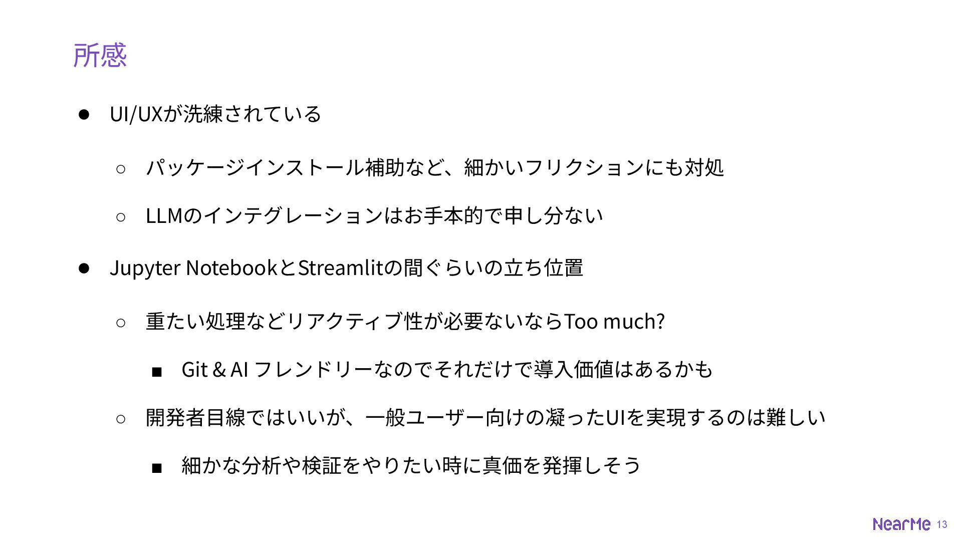NotebookとStreamlitの間ぐらいの⽴ち位置 ◦ 重たい処理などリアクティブ性が必要ないならToo much? ▪ Git & AI フレンドリーなのでそれだけで導⼊価値はあるかも ◦ 開発者⽬線ではいいが、⼀般ユーザー向けの凝ったUIを実現するのは難しい ▪ 細かな分析や検証をやりたい時に真価を発揮しそう