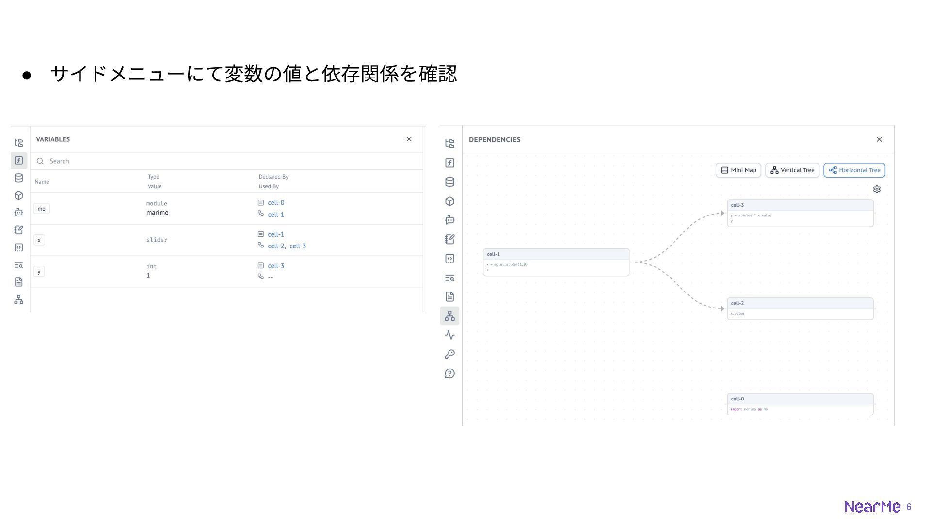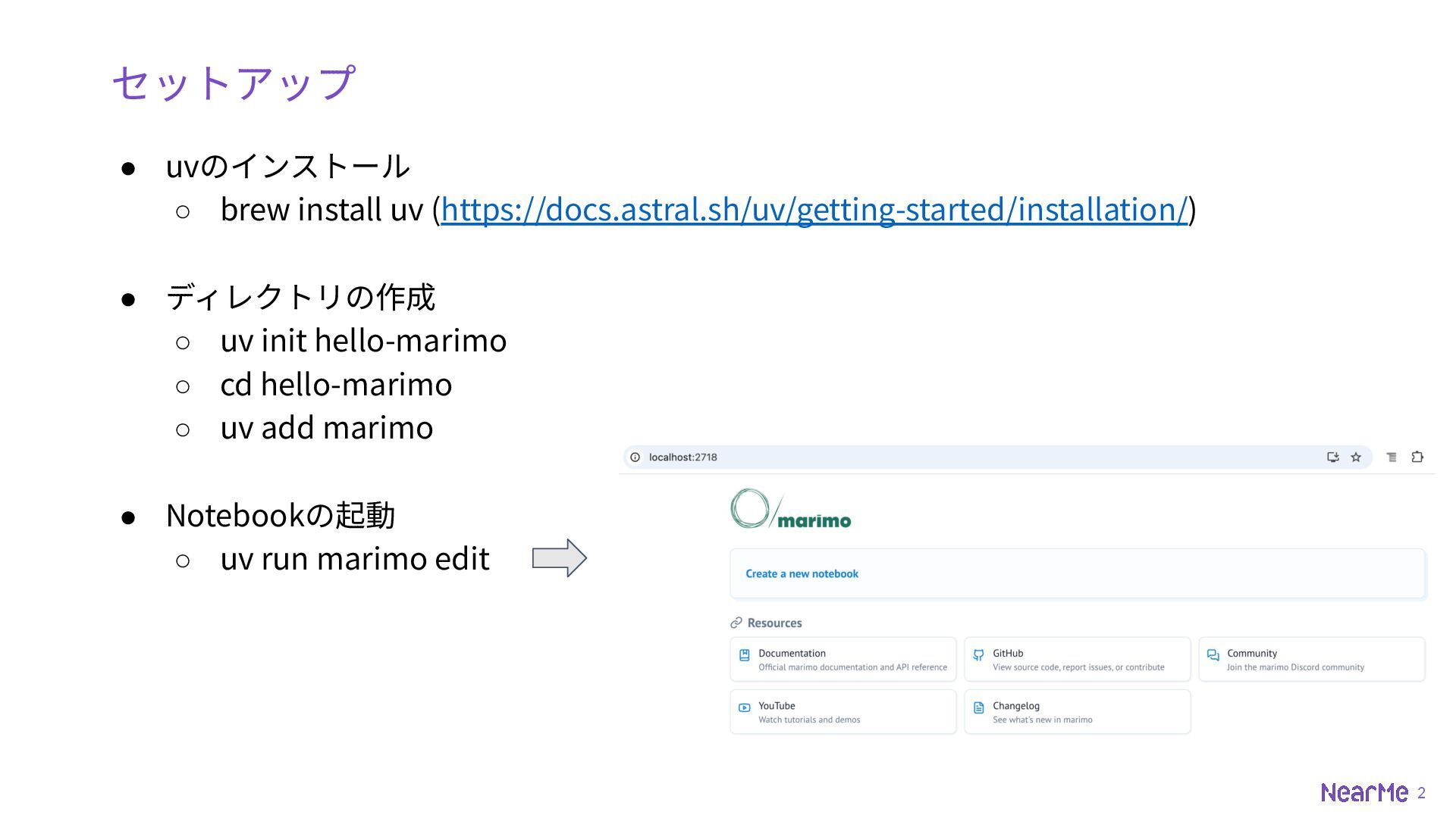 ディレクトリの作成 ◦ uv init hello-marimo ◦ cd hello-marimo ◦ uv add marimo • Notebookの起動 ◦ uv run marimo edit