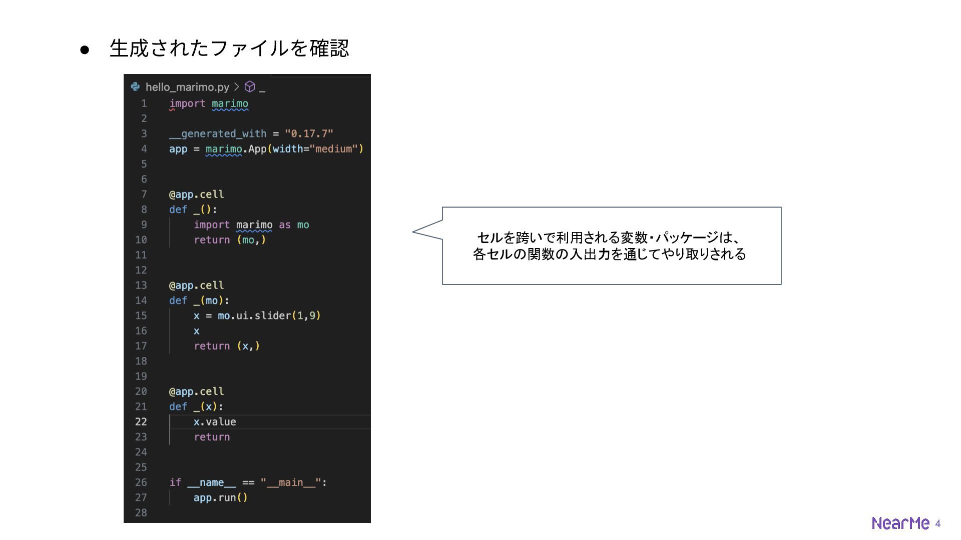 4 • ⽣成されたファイルを確認 セルを跨いで利用される変数・パッケージは、 各セルの関数の入出力を通じてやり取りされる