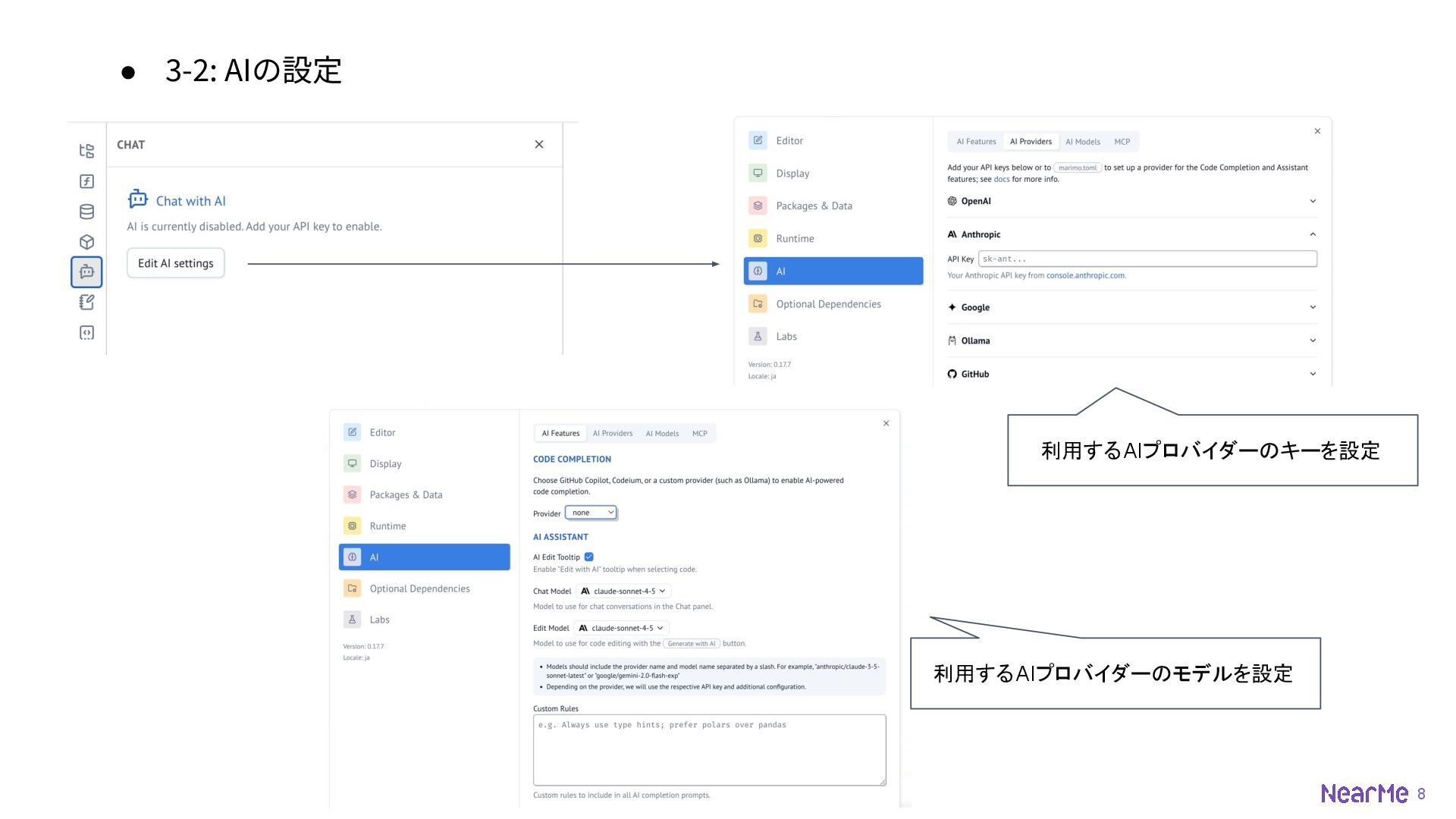 8 • 3-2: AIの設定 利用するAIプロバイダーのキーを設定 利用するAIプロバイダーのモデルを設定