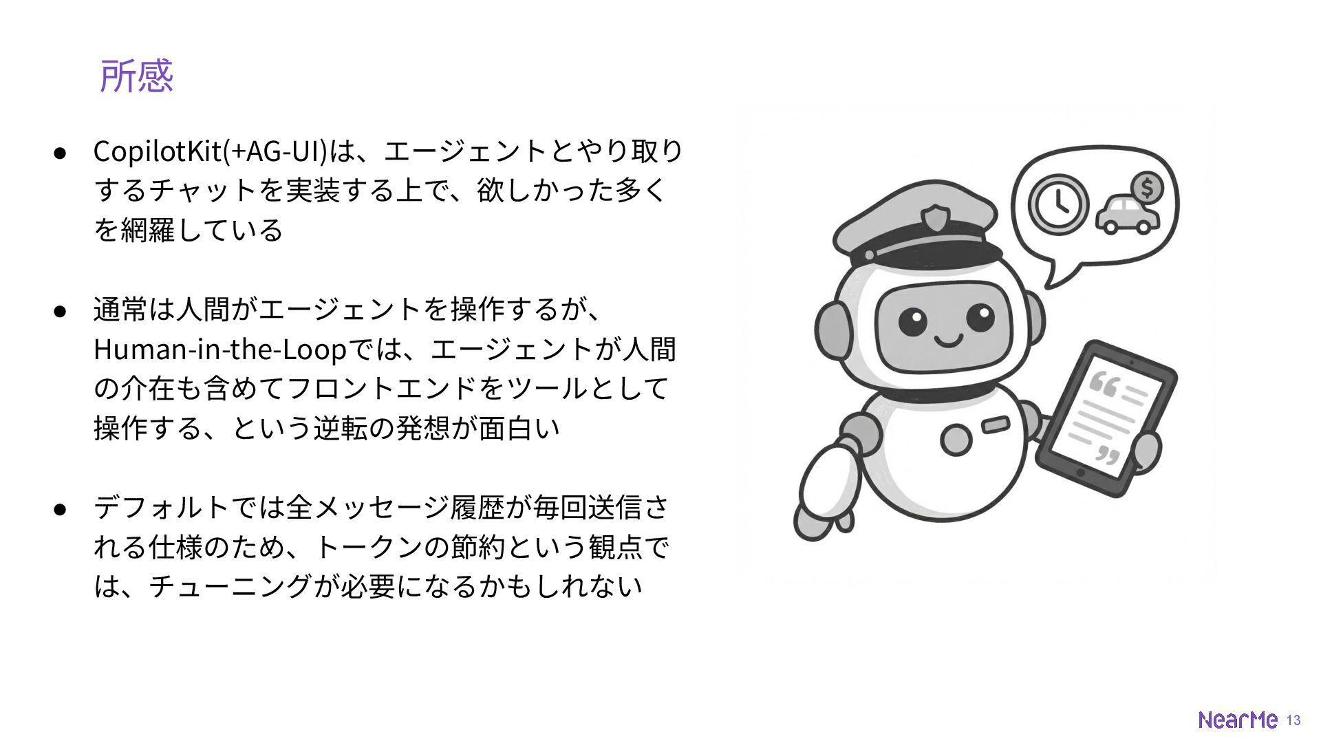 5. 13 所感 • CopilotKit(+AG-UI)は、エージェントとやり取り するチャットを実装する上で、欲しかった多く を網羅している • 通常は⼈間がエージェントを操作するが、 Human-in-the-Loopでは、エージェントが⼈間 の介在も含めてフロントエンドをツールとして