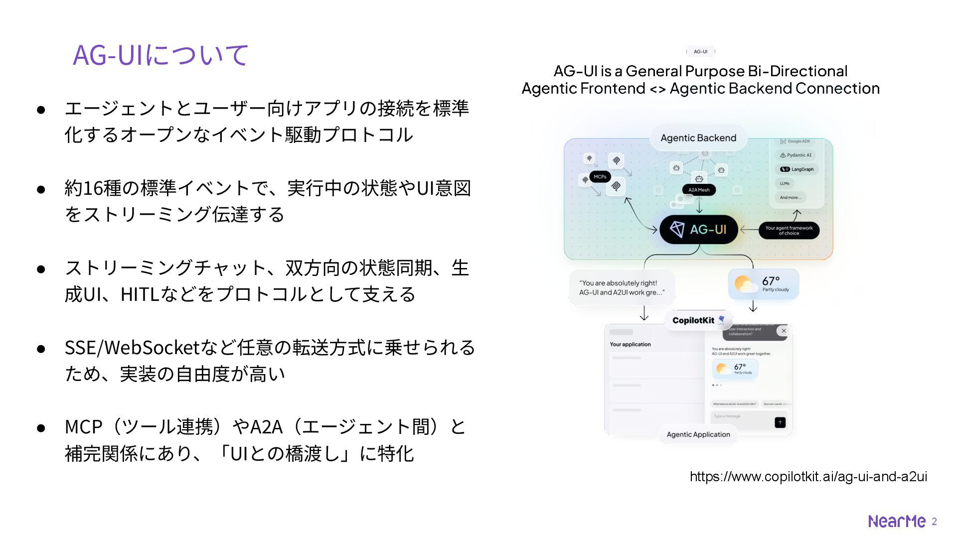 1. 2 AG-UIについて • エージェントとユーザー向けアプリの接続を標準 化するオープンなイベント駆動プロトコル • 約16種の標準イベントで、実⾏中の状態やUI意図 をストリーミング伝達する • ストリーミングチャット、双⽅向の状態同期、⽣