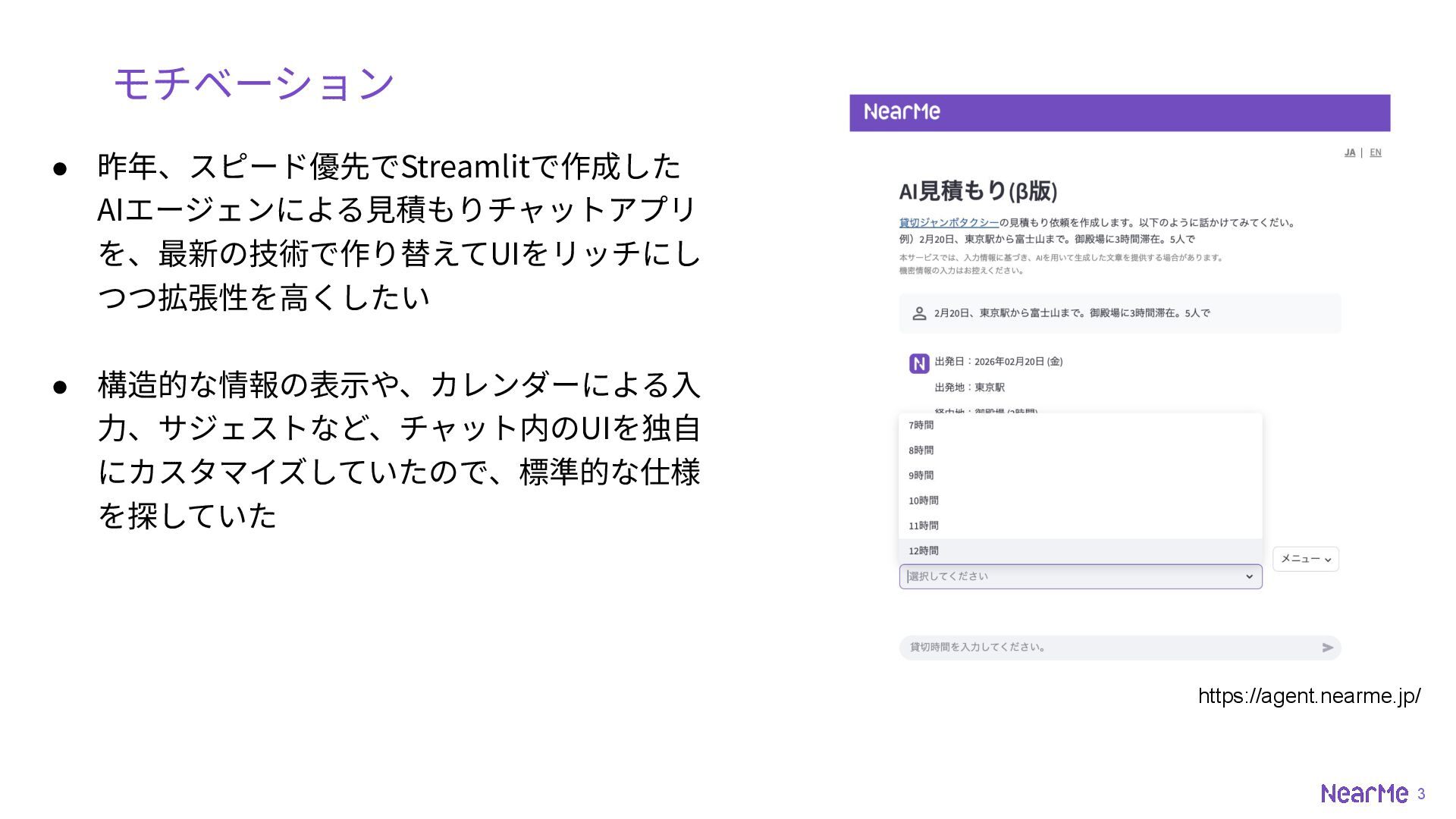 従来のチャットボットUIの限界を超え、AIエージェントとユーザーがシームレスに協調するアプリケーションを作りたい開発者向けの資料です。