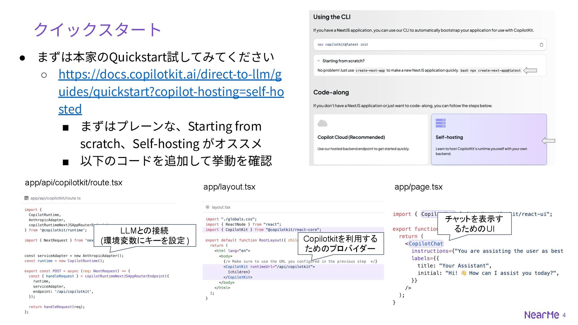 from scratch、Self-hosting がオススメ ▪ 以下のコードを追加して挙動を確認 LLMとの接続 (環境変数にキーを設定 ) Copilotkitを利用する ためのプロバイダー チャットを表示す るためのUI app/page.tsx app/layout.tsx app/api/copilotkit/route.tsx