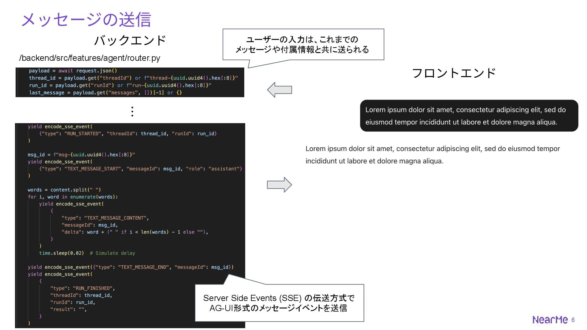 3. 6 メッセージの送信 バックエンド フロントエンド Server Side Events (SSE) の伝送方式で AG-UI形式のメッセージイベントを送信