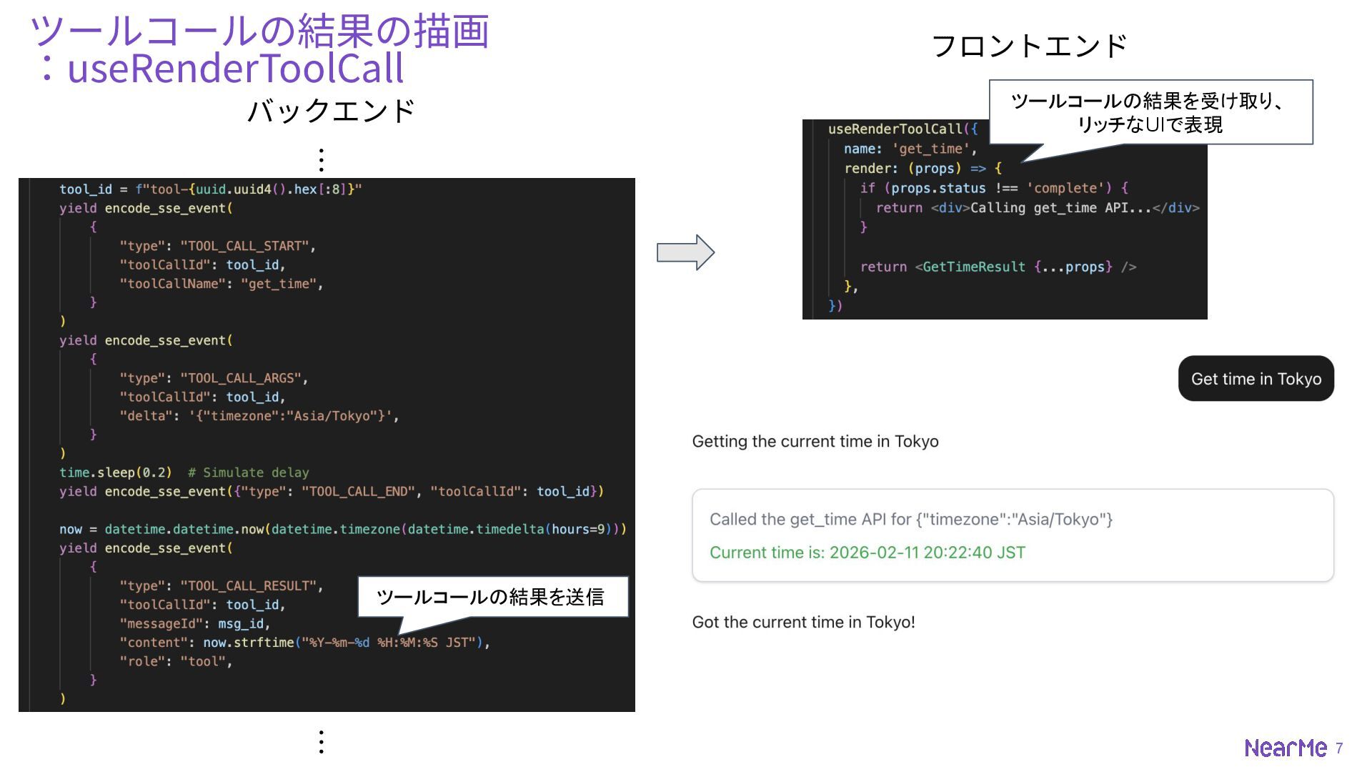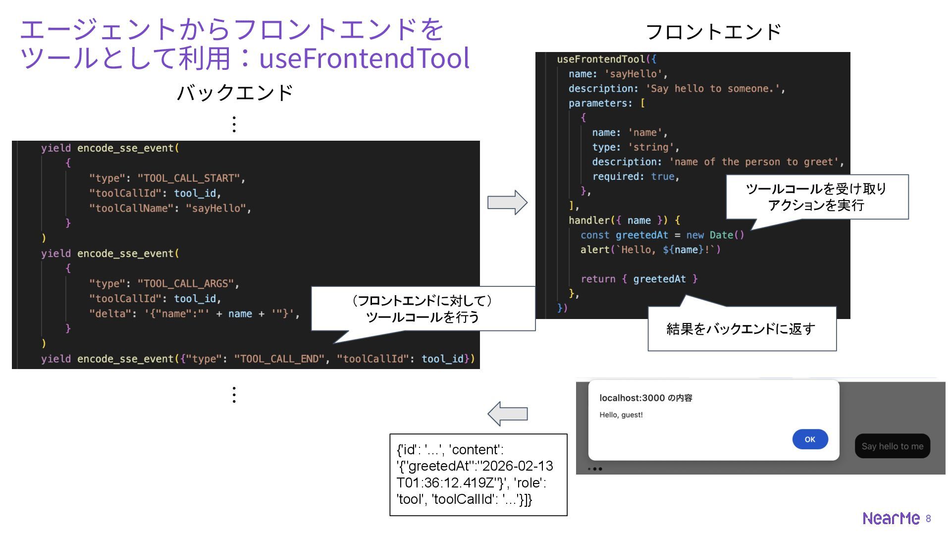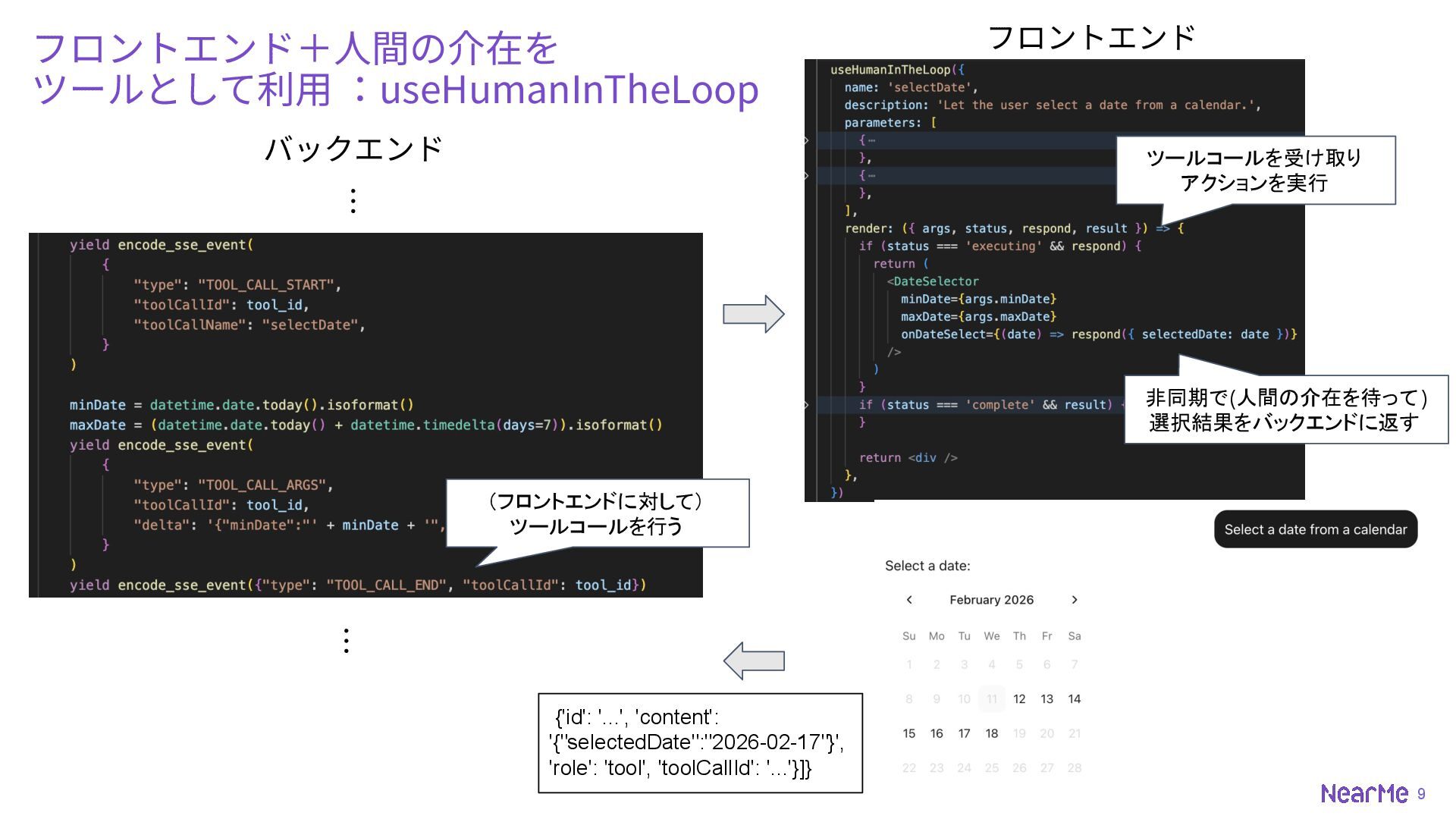 ツールコールを受け取り アクションを実行 非同期で(人間の介在を待って ) 選択結果をバックエンドに返す {'id': '...', 'content': '{"selectedDate":"2026-02-17"}', 'role': 'tool', 'toolCallId': '...'}]}