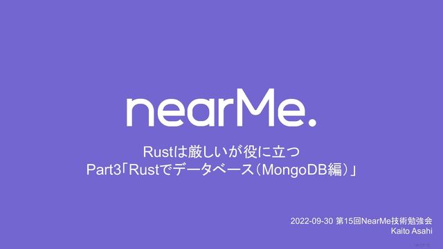0 Rustは厳しいが役に立つ Part3「Rustでデータべース(MongoDB編)」 2022-09-30 第15回NearMe技術勉強会 Kaito Asahi