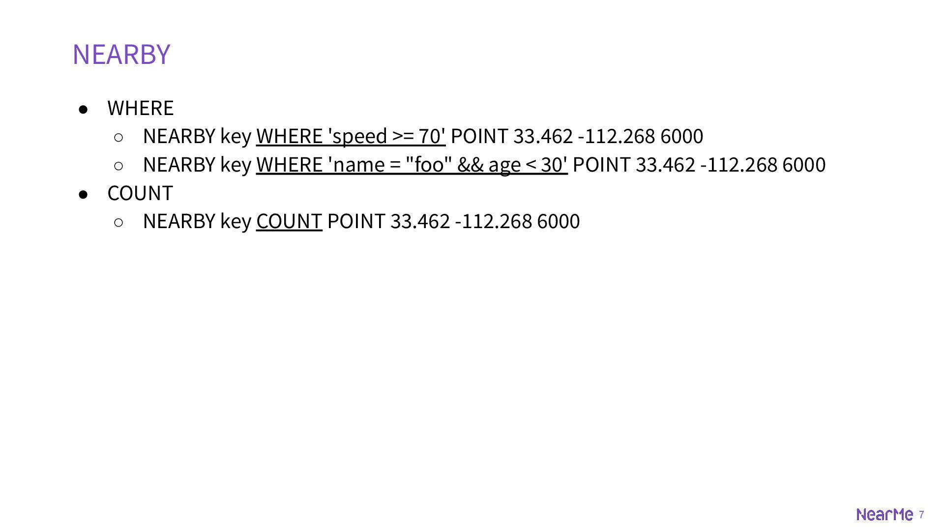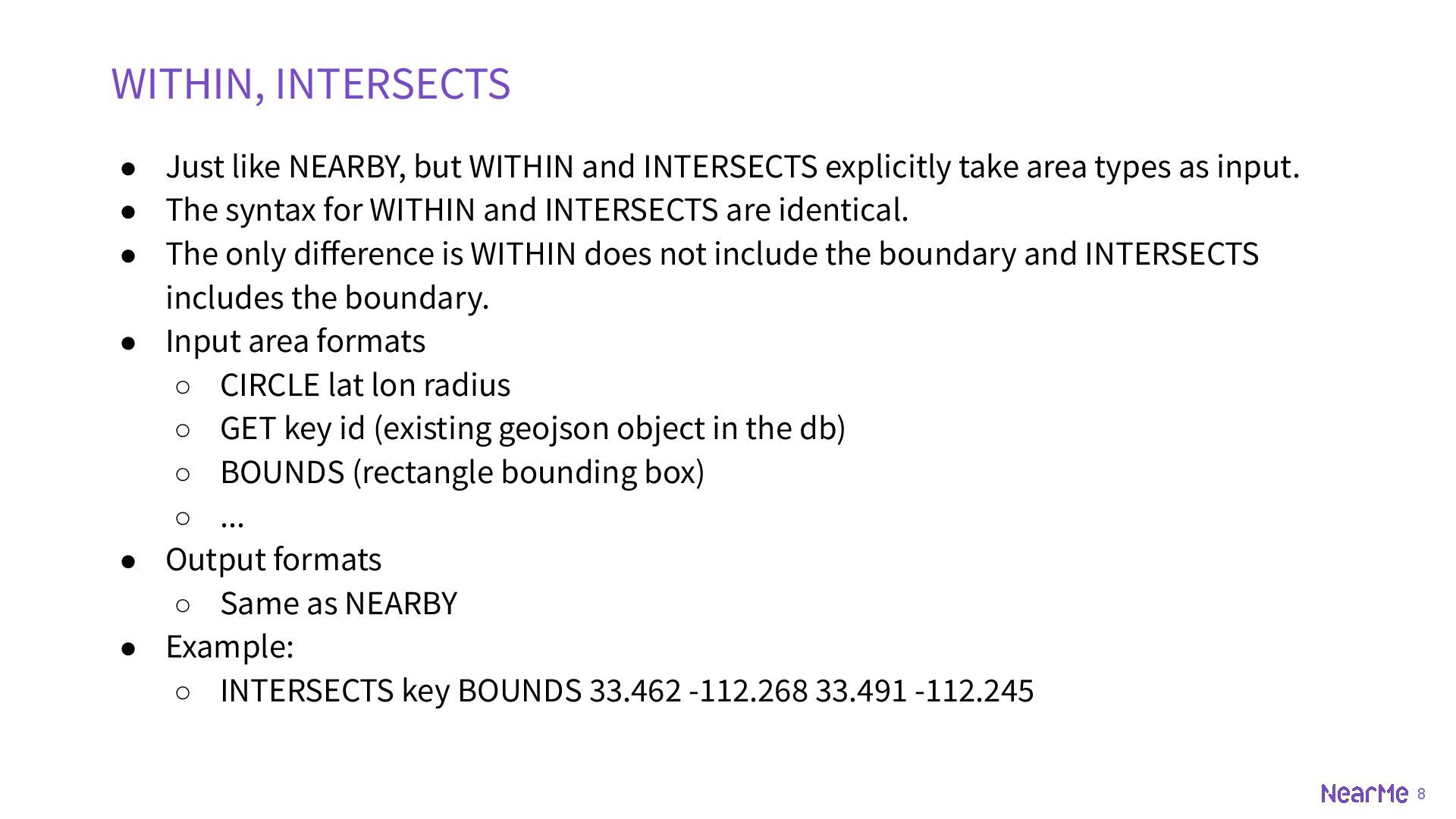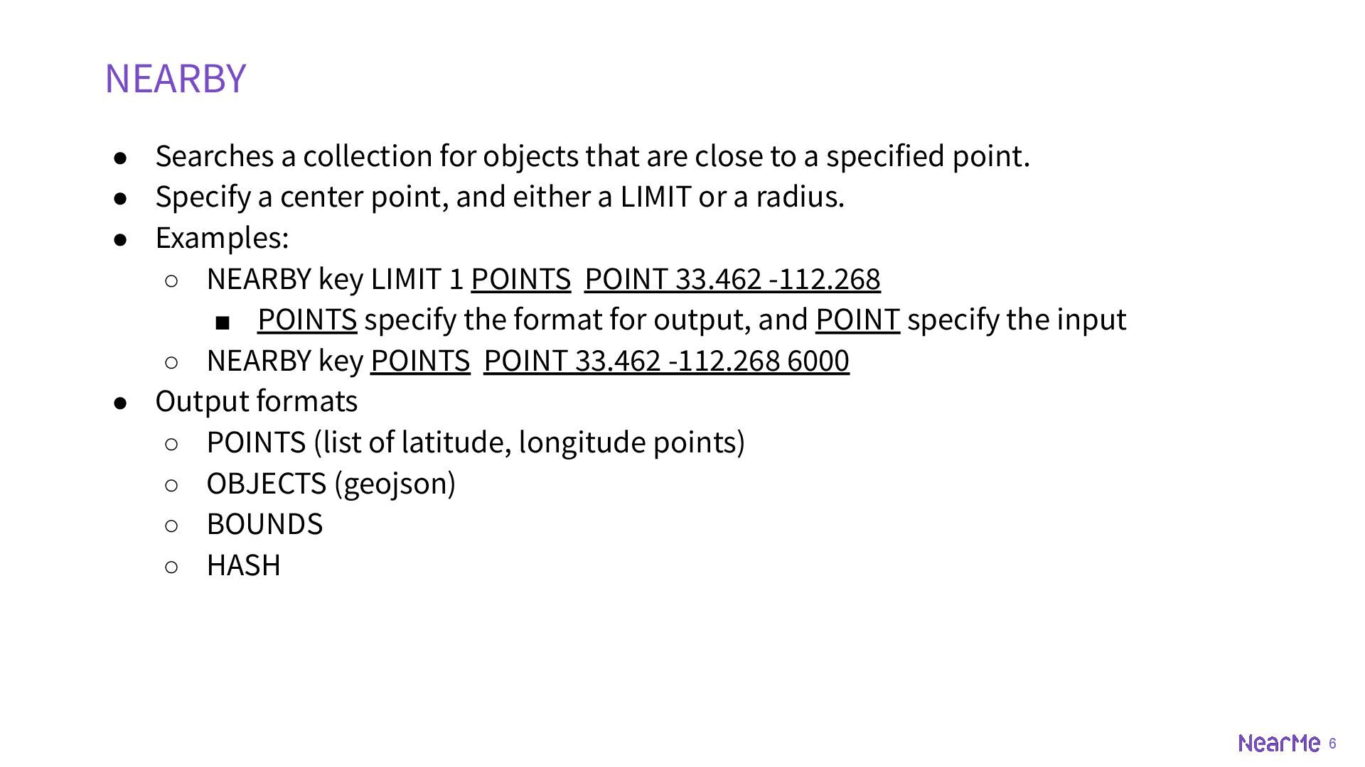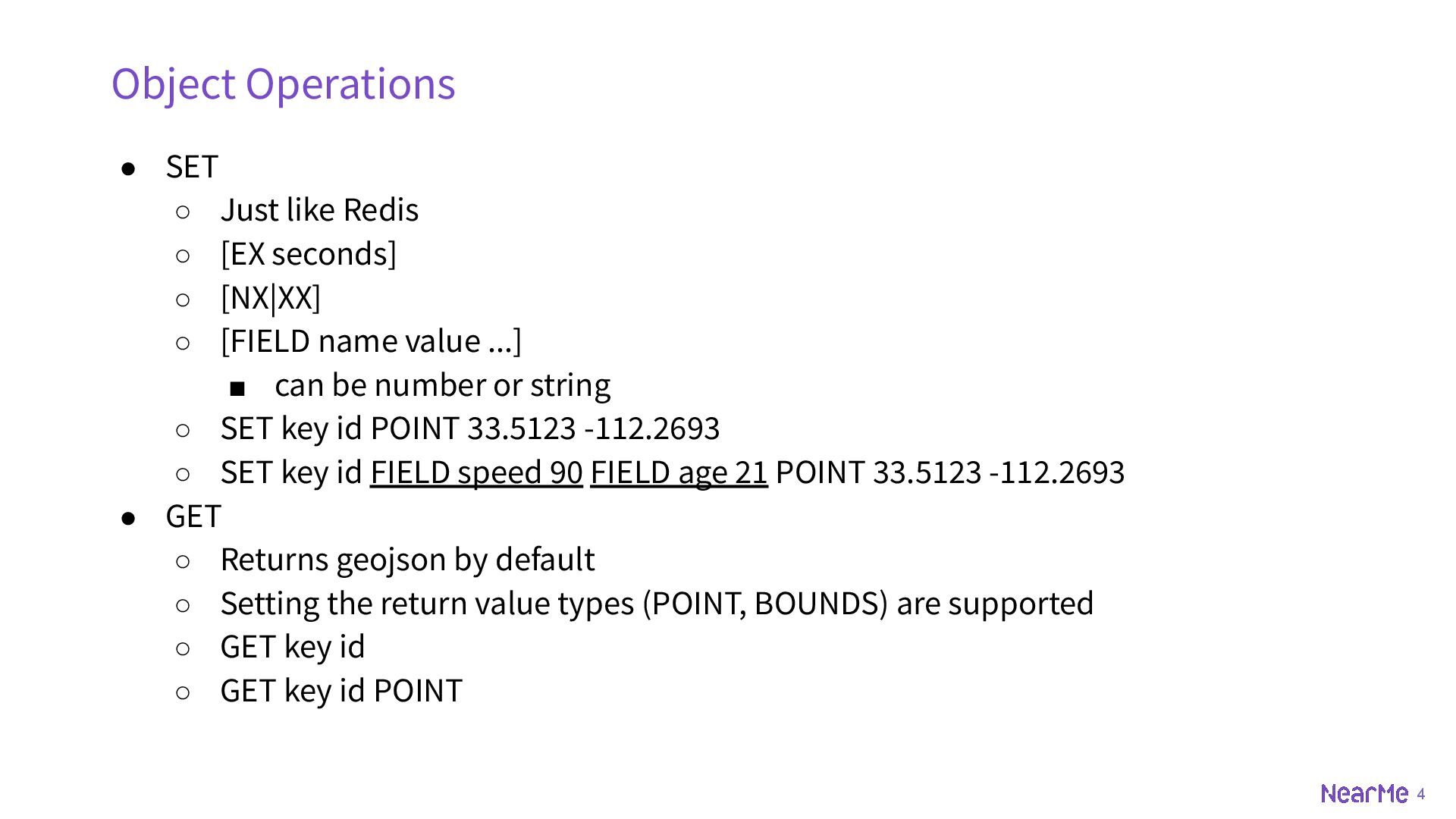 z-coord ◦ SET key id POINT 33.5123 -112.2693 ◦ SET key id POINT 33.5123 -112.2693 225 • BOUNDS ◦ rectangle ◦ SET key id BOUNDS 30 -110 40 -100 • OBJECT ◦ geojson, could be point, multipoint, linestring, multilinestring, polygon, multipolygon, geometrycollection etc. ◦ SET key id OBJECT '{"type":"Polygon","coordinates":[[[-111.9787,33.4411],[-111.8902,33.4377],[-11 1.8950,33.2892],[-111.9739,33.2932],[-111.9787,33.4411]]]}'