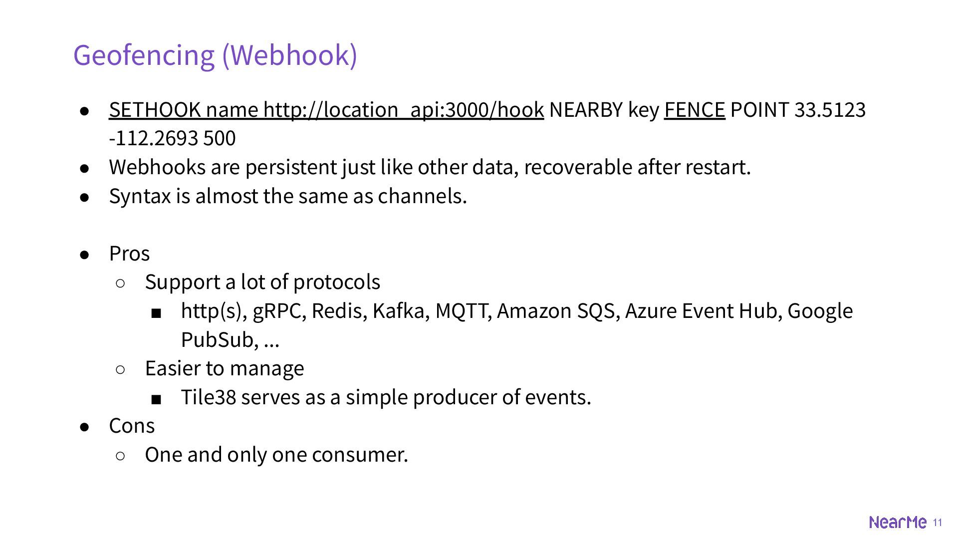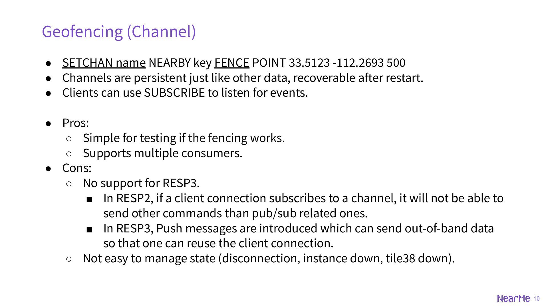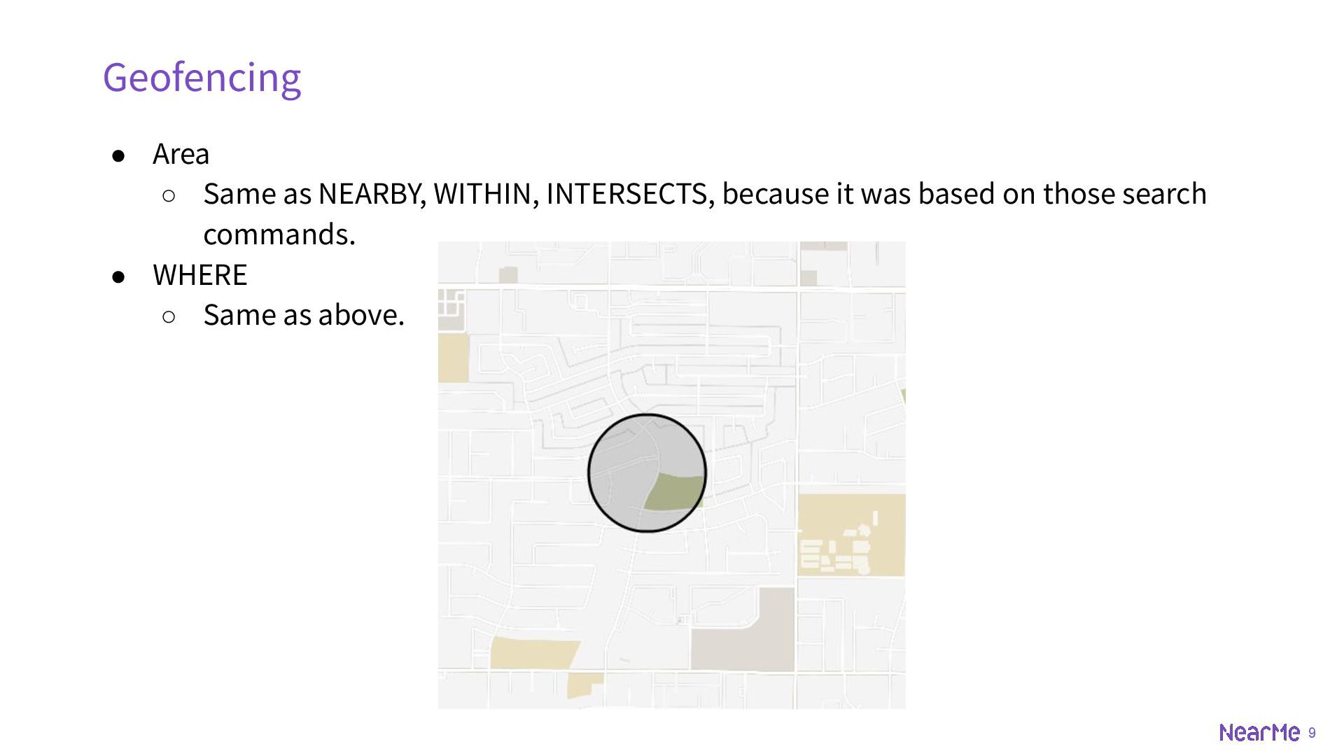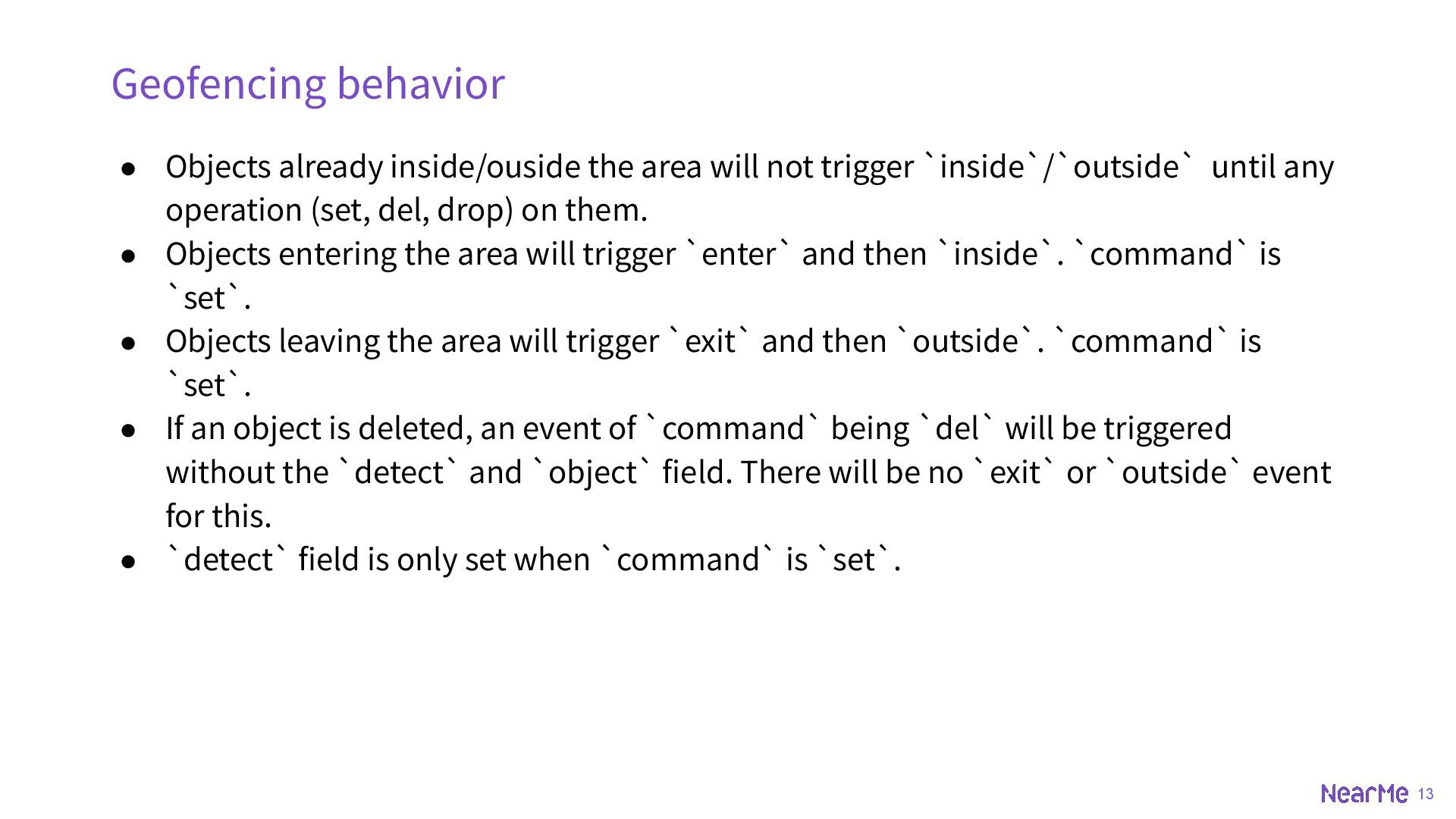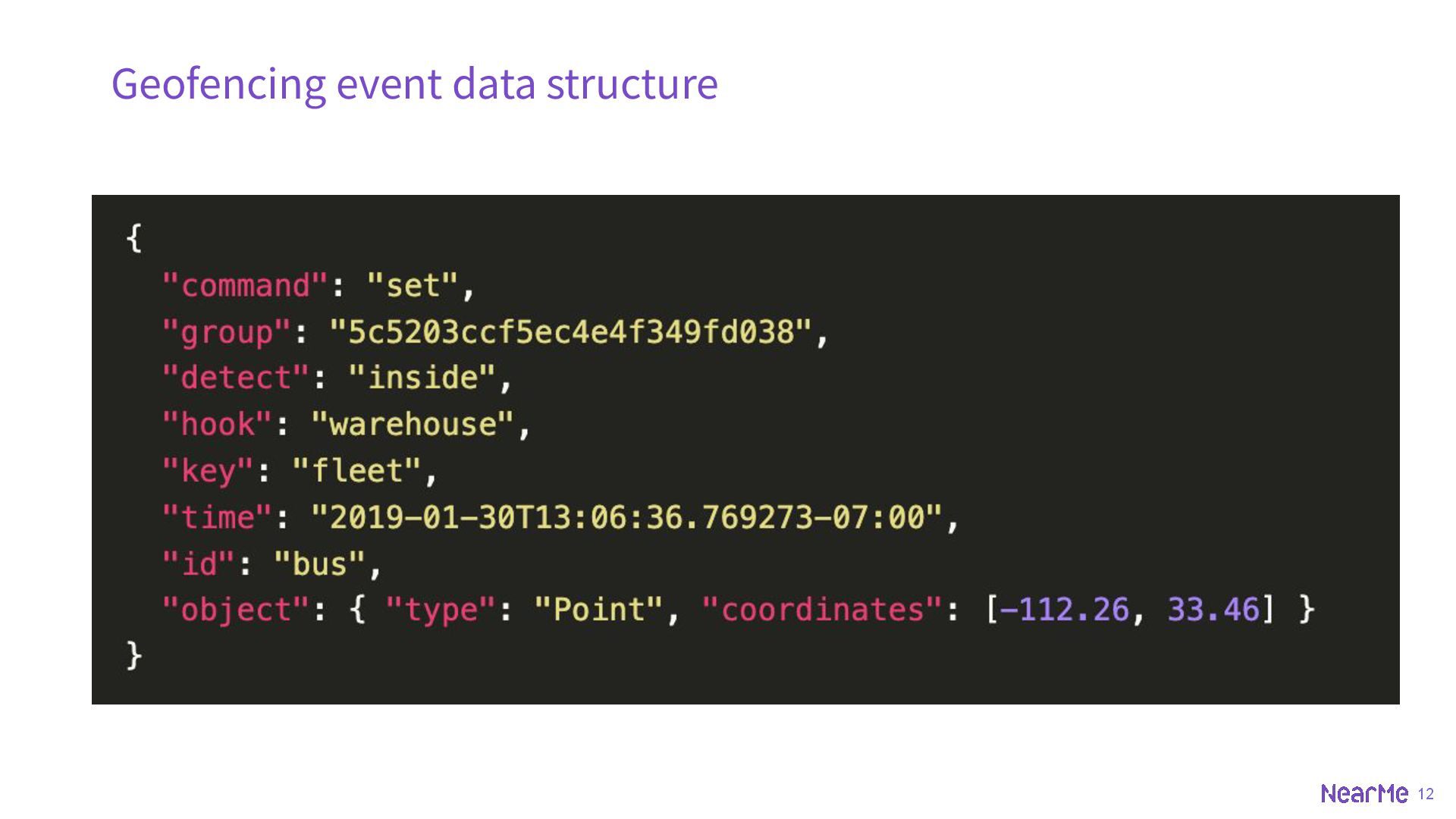 z-coord ◦ SET key id POINT 33.5123 -112.2693 ◦ SET key id POINT 33.5123 -112.2693 225 • BOUNDS ◦ rectangle ◦ SET key id BOUNDS 30 -110 40 -100 • OBJECT ◦ geojson, could be point, multipoint, linestring, multilinestring, polygon, multipolygon, geometrycollection etc. ◦ SET key id OBJECT '{"type":"Polygon","coordinates":[[[-111.9787,33.4411],[-111.8902,33.4377],[-11 1.8950,33.2892],[-111.9739,33.2932],[-111.9787,33.4411]]]}'