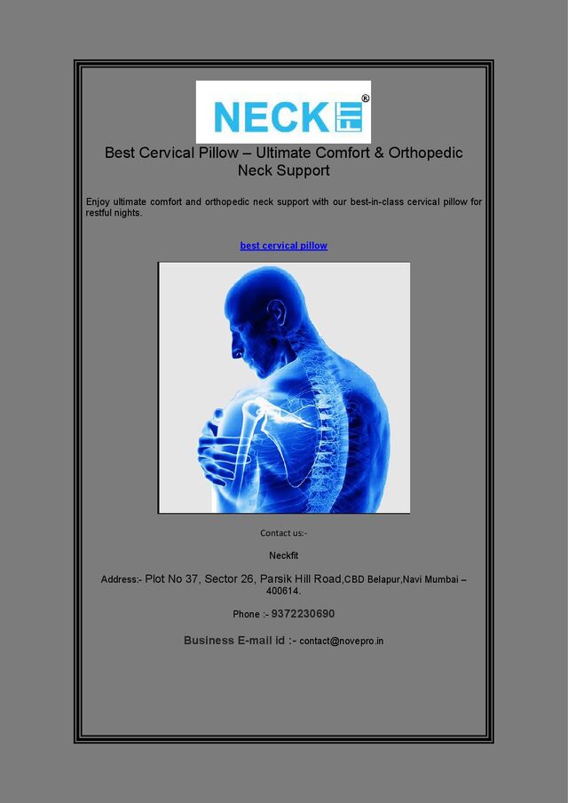 Enjoy ultimate comfort and orthopedic neck support with our best-in-class cervical pillow for restful nights. best cervical pillow Contact us:- Neckfit Address:- Plot No 37, Sector 26, Parsik Hill Road,CBD Belapur,Navi Mumbai – 400614. Phone :- 9372230690 Business E-mail id :- [email protected]