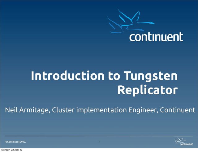 parallel replication mysql -e 'select seqno, source_id, shard_id,update_timestamp from tungsten_cookbook.trep_commit_seqno' +-------+----------------------+----------+---------------------+ | seqno | source_id | shard_id | update_timestamp | +-------+----------------------+----------+---------------------+ | 7 | qa.r1.continuent.com | db1 | 2012-11-30 20:54:14 | | 8 | qa.r1.continuent.com | db2 | 2012-11-30 20:54:14 | | 9 | qa.r1.continuent.com | db3 | 2012-11-30 20:54:14 | | 10 | qa.r1.continuent.com | db4 | 2012-11-30 20:54:14 | | 11 | qa.r1.continuent.com | db5 | 2012-11-30 20:54:14 | | 12 | qa.r1.continuent.com | db6 | 2012-11-30 20:54:14 | | 13 | qa.r1.continuent.com | db7 | 2012-11-30 20:54:14 | | 14 | qa.r1.continuent.com | db8 | 2012-11-30 20:54:14 | | 15 | qa.r1.continuent.com | db9 | 2012-11-30 20:54:14 | | 16 | qa.r1.continuent.com | db10 | 2012-11-30 20:54:14 | +-------+----------------------+----------+---------------------+ 44 Monday, 22 April 13
