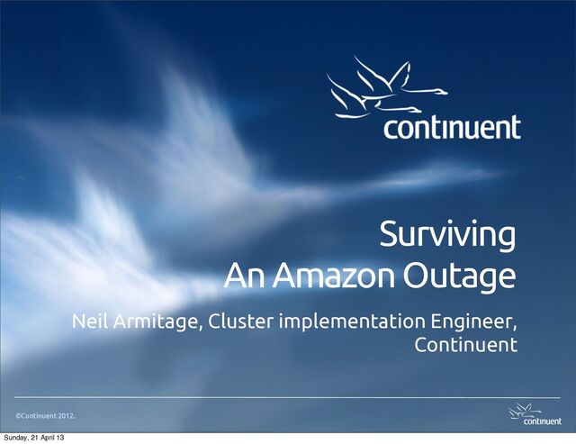 in AWS • Review carried out in the Summer of 2012 after several AWS Outages • Treated the review as a Customer engagement • Further review in Autumn of 2012 leading to the Multi-Cloud deployment Sunday, 21 April 13