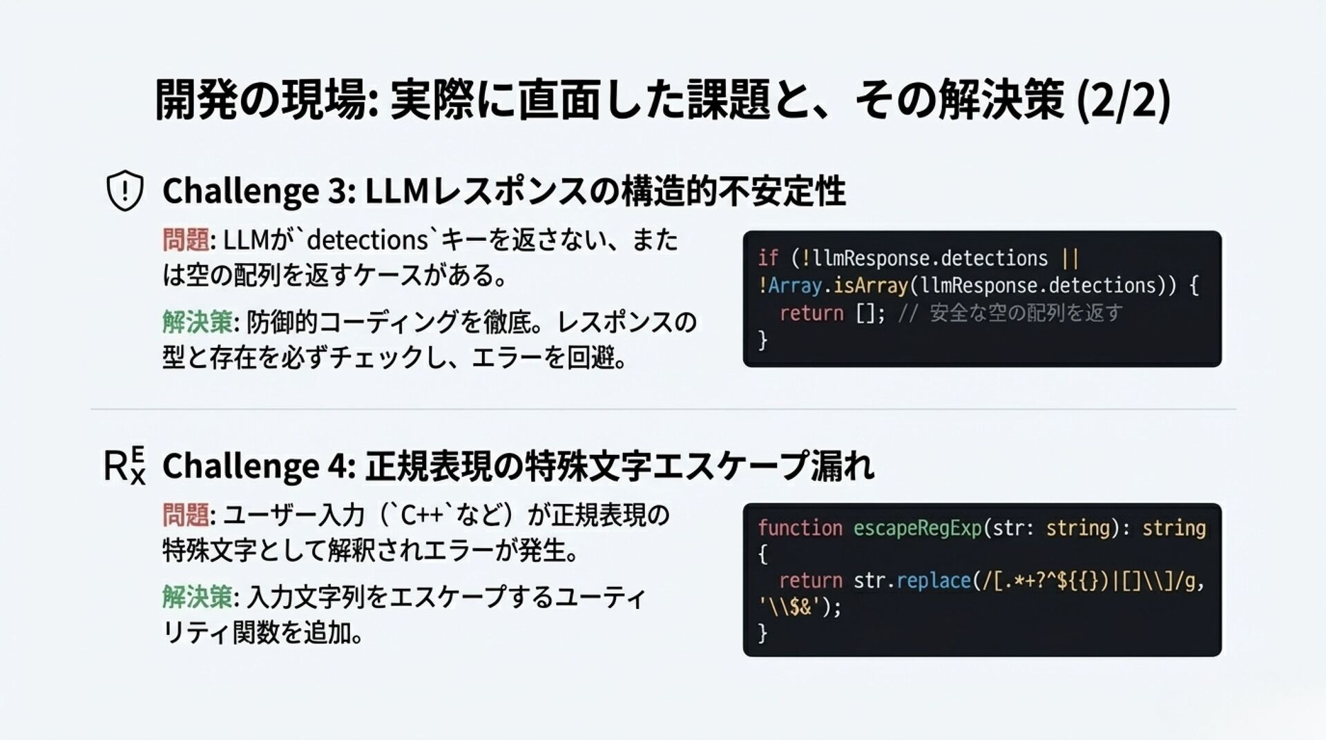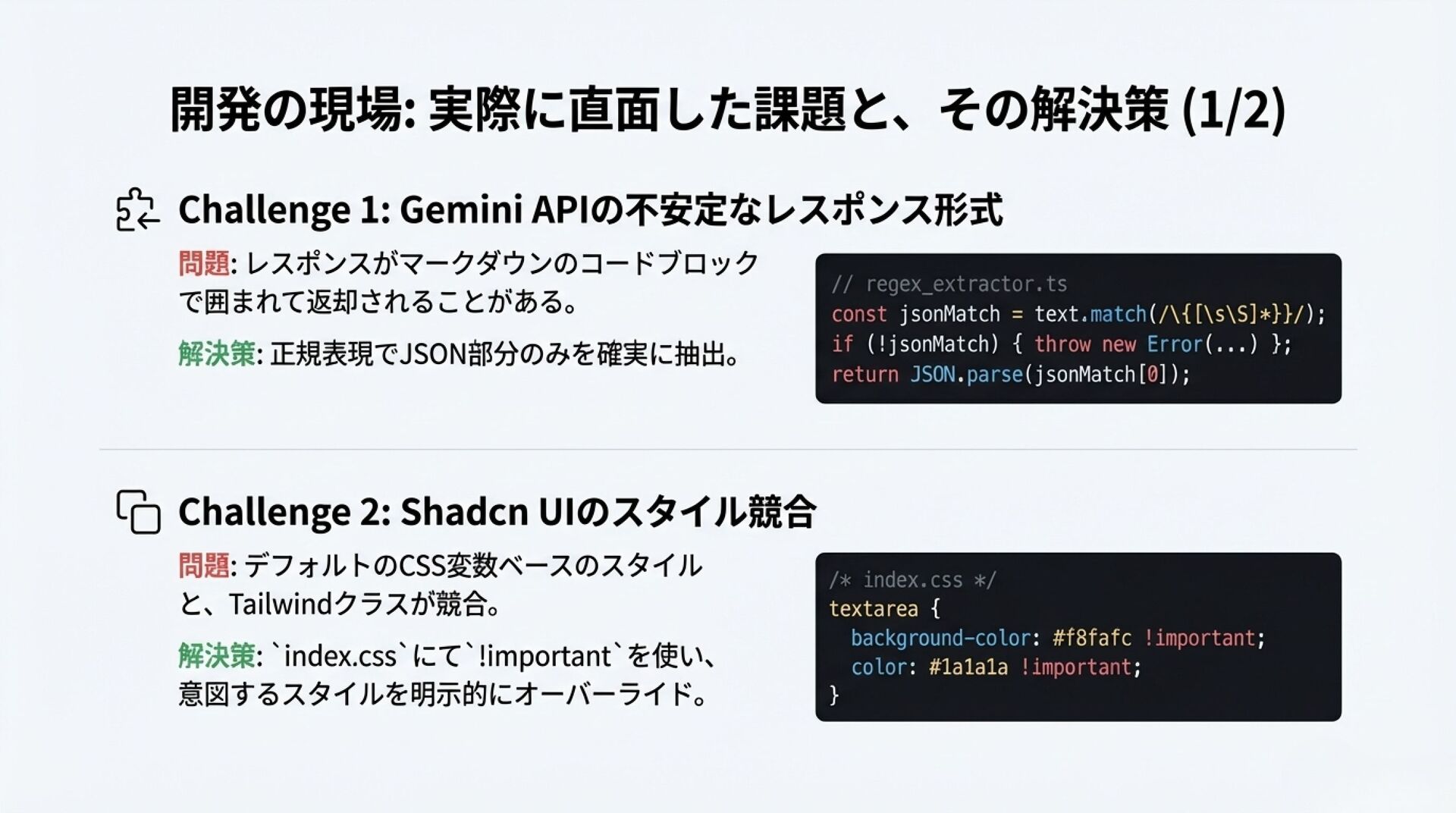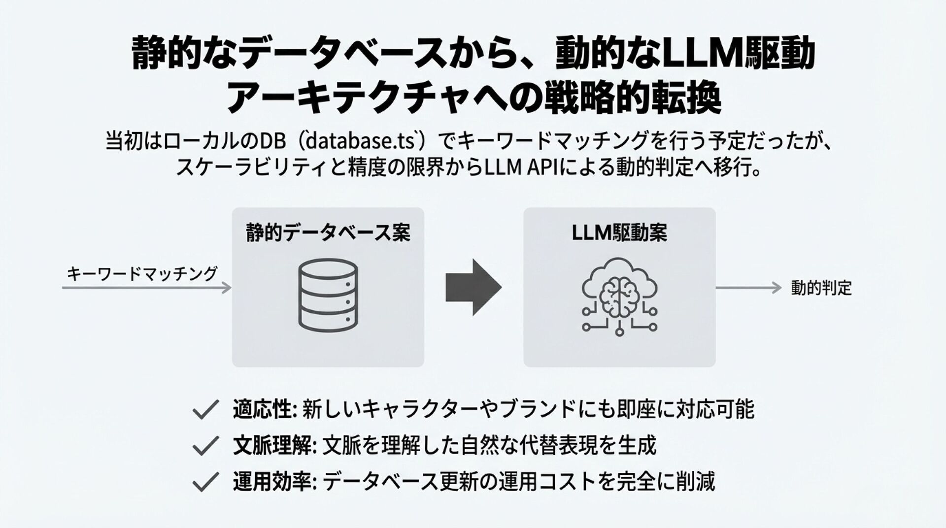 静的なデータベース判定からLLMによる動的判定へピボットした経緯や、Shadcn UI × Tailwind CSSでの実装Tipsをまとめています。