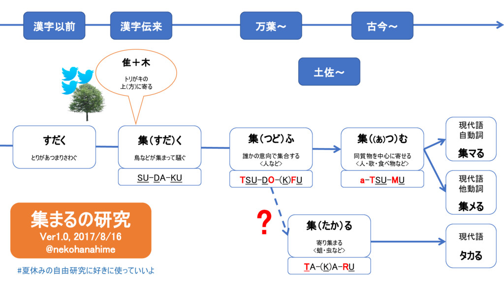 集((あ)つ)む 同質物を中心に寄せる <人・歌・食べ物など> a-TSU-MU 集(たか)る 寄り集まる <蛆・虫など> TA-(K)A-RU 現代語 自動詞 集マる 現代語 他動詞 集メる 現代語 タカる 漢字伝来 すだく とりがあつまりさわぐ 漢字以前 万葉~ 古今~ 土佐~ 集まるの研究 Ver1.0, 2017/8/16 @nekohanahime ? #夏休みの自由研究に好きに使っていいよ