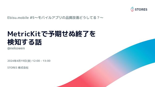 STORES 株式会社 @nekowen Ebisu.mobile #5〜モバイルアプリの品質改善どうしてる?〜 2024年4月19日(金) 12:00 - 13:00 MetricKitで予期せぬ終了を