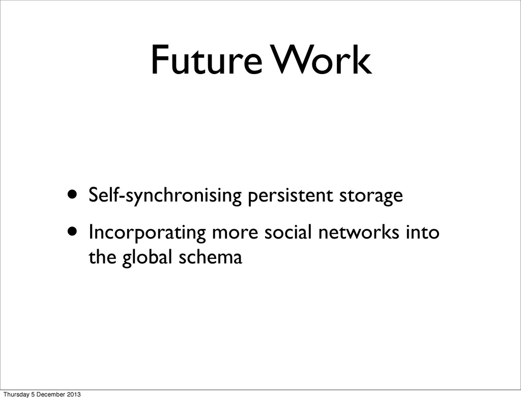 Future Work • Self-synchronising persistent storage • Incorporating more social