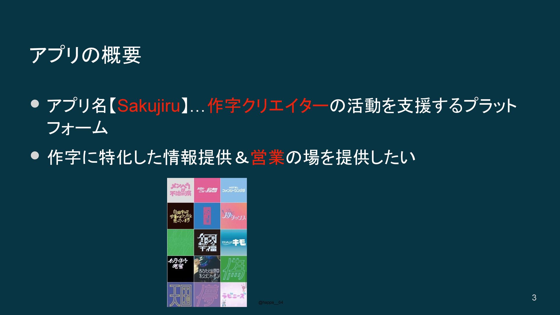 本資料は、個人開発として制作した**作字クリエイター支援SNS『Sakujiru』**の最終発表用スライドです。 作字(タイポグラフィ)に携わるクリエイターと、依頼者をつなぐ新しいマッチングの形を提案しています。